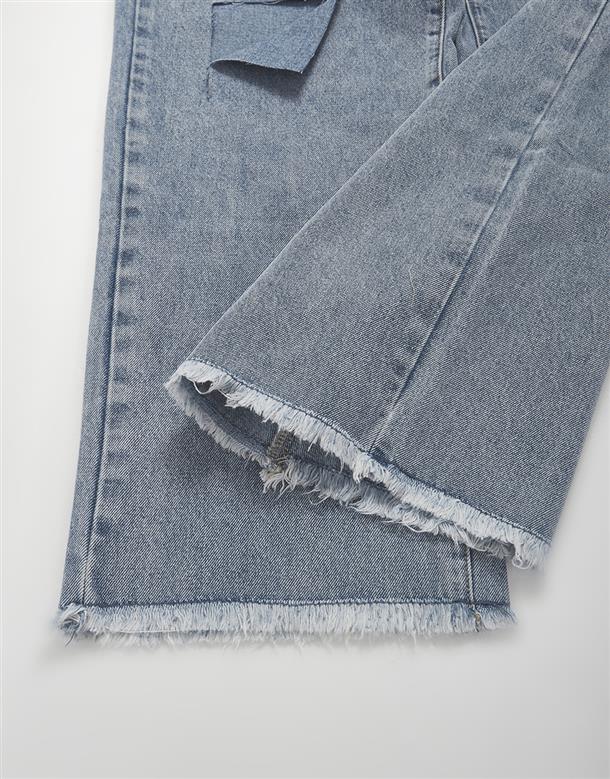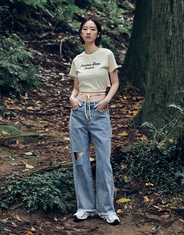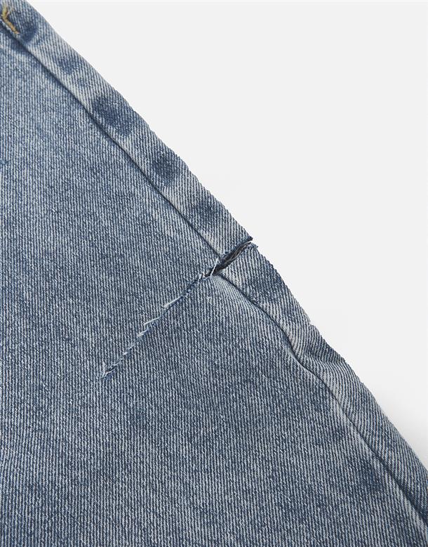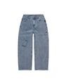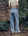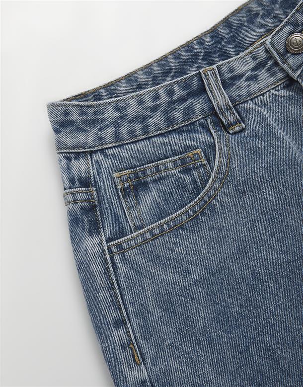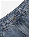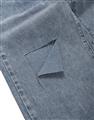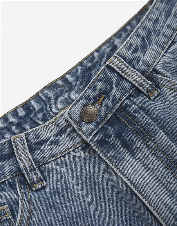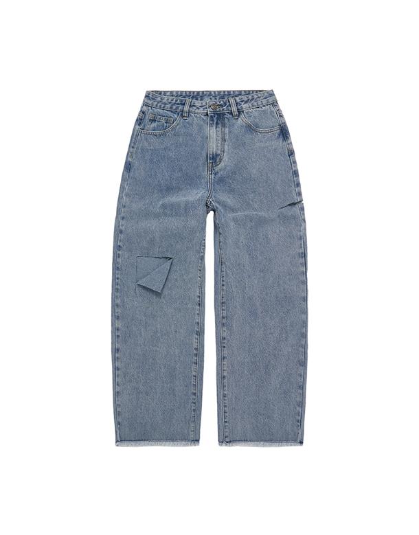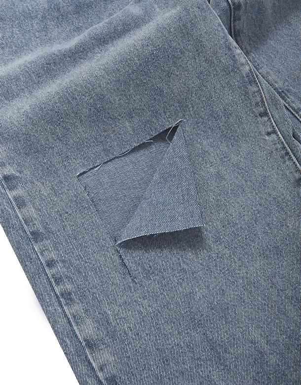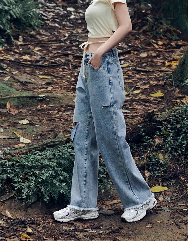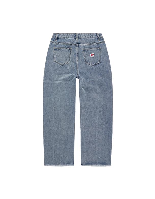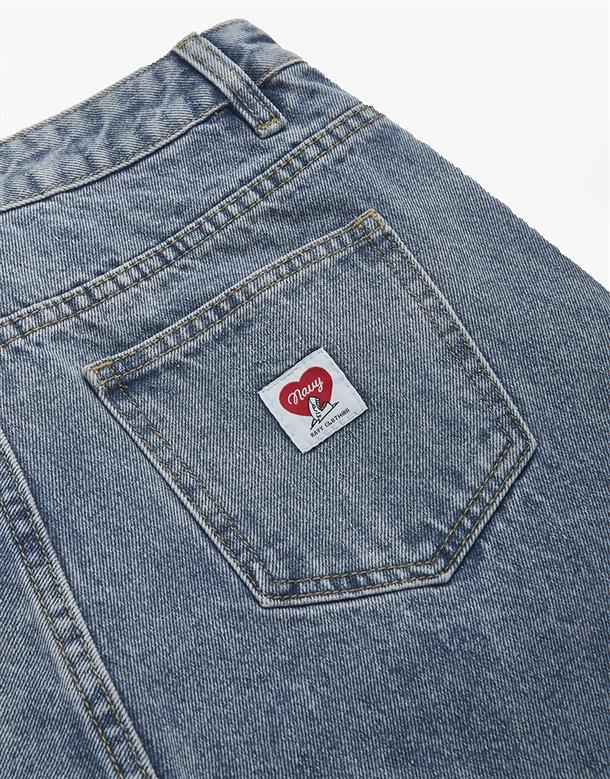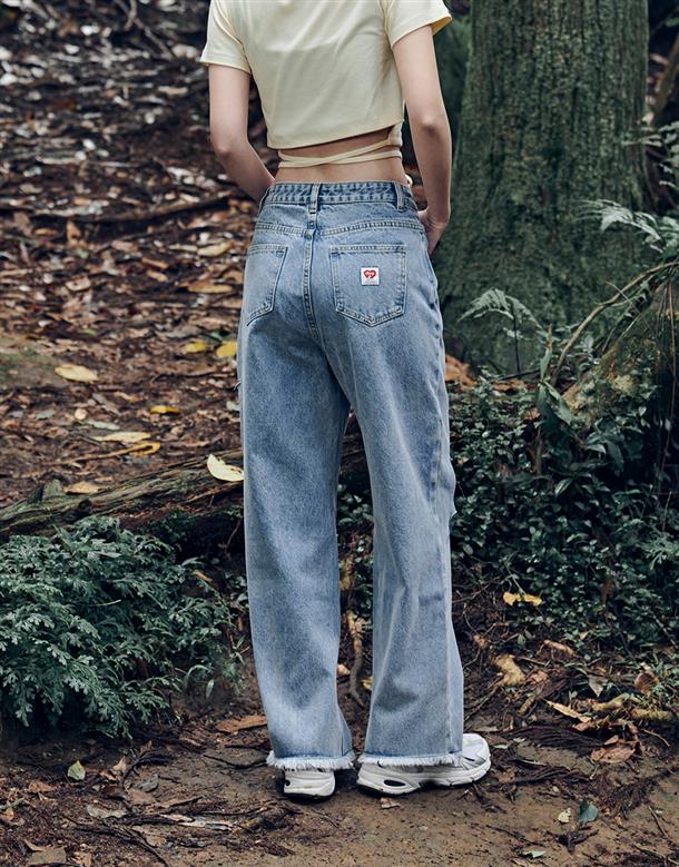 NAVY愛心鯊魚織標,不對稱割破設計,率性直筒牛仔褲。