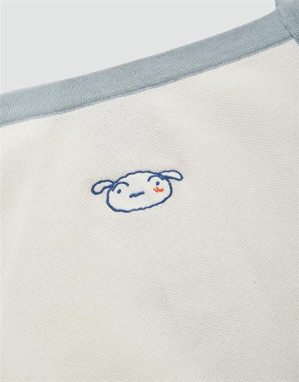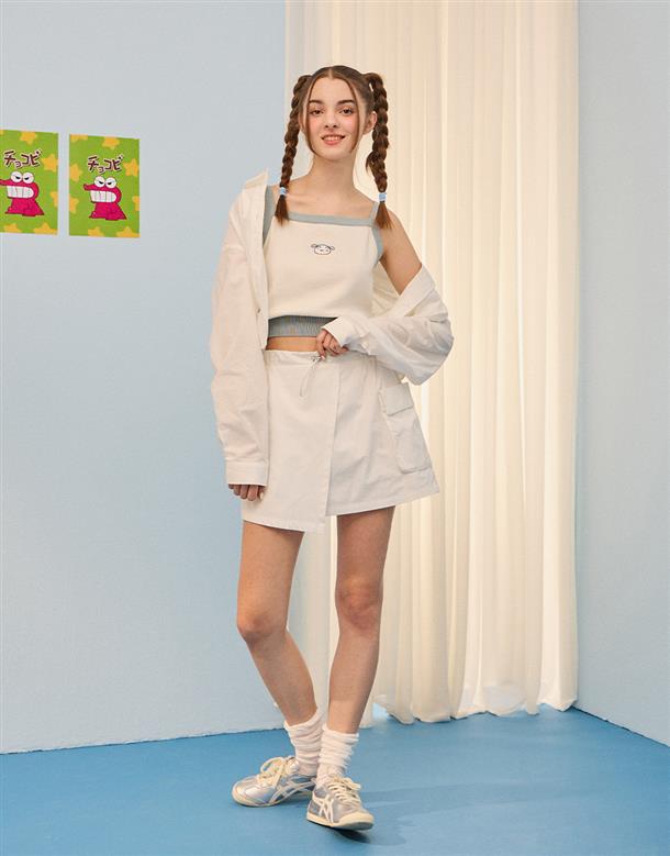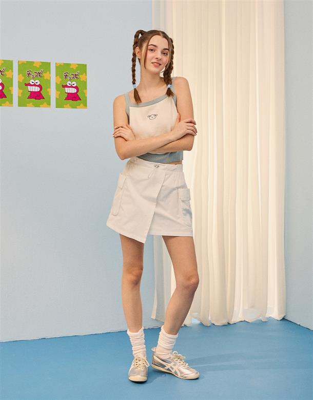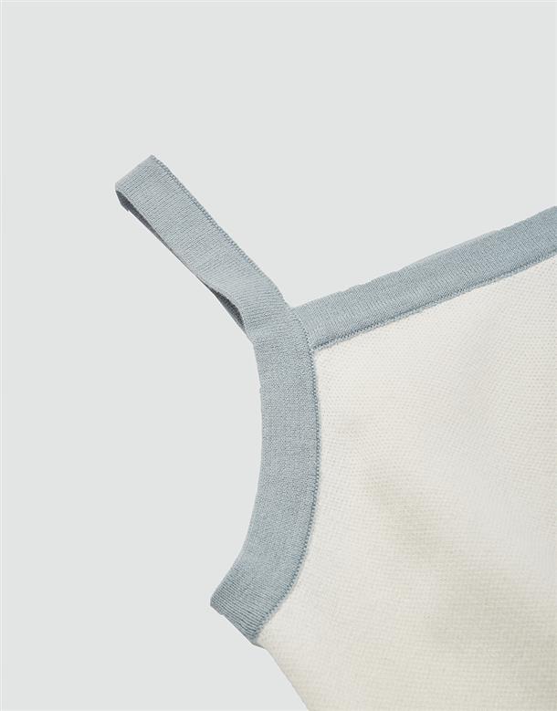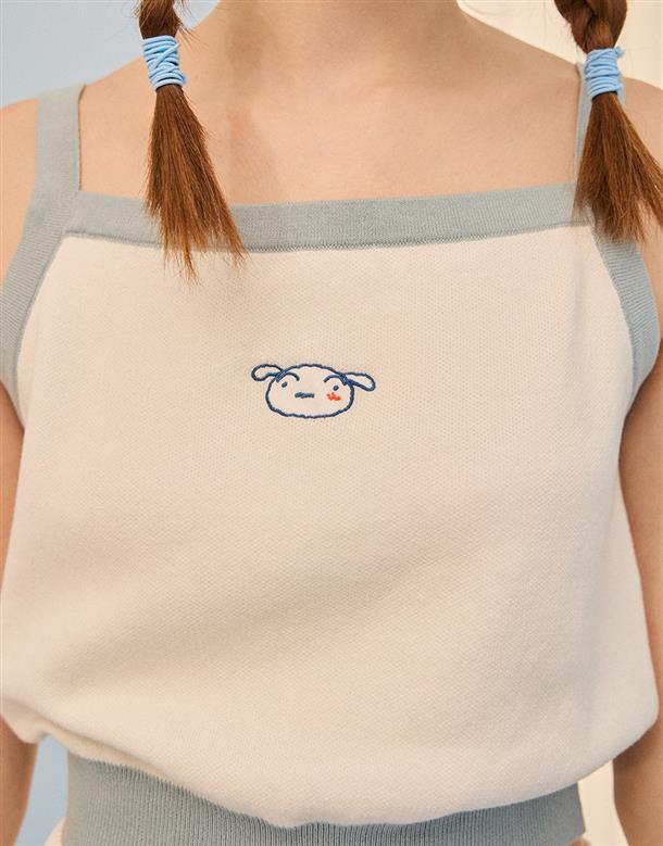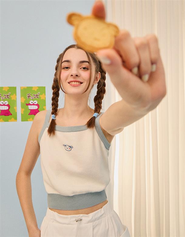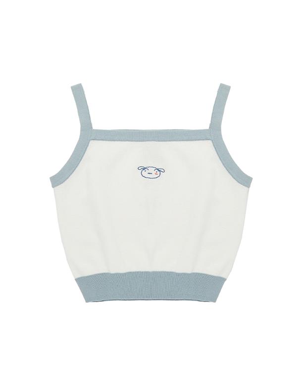 小白短版針織背心,撞色設計與電繡,舒適棉紗穿搭款。