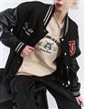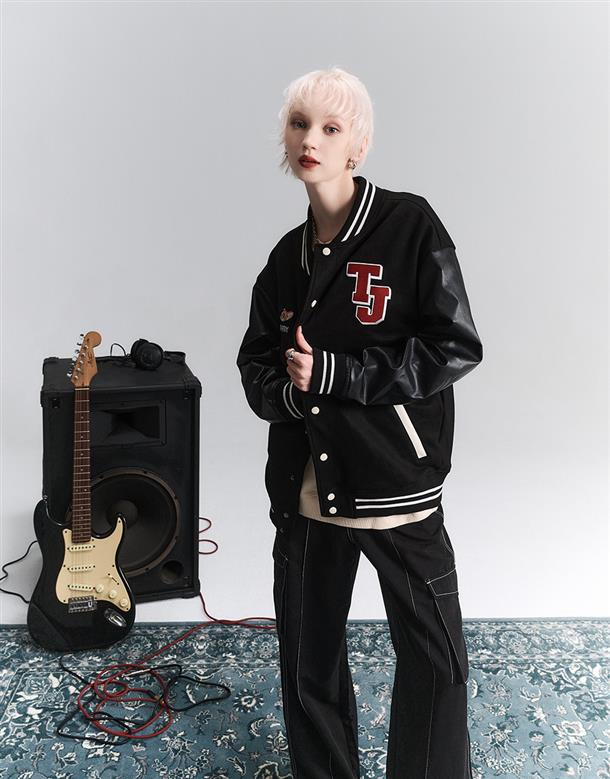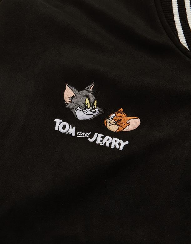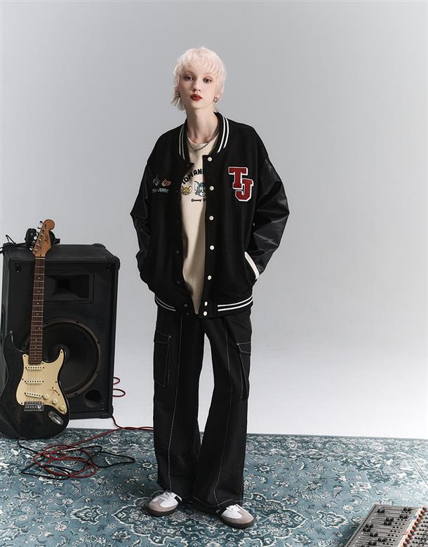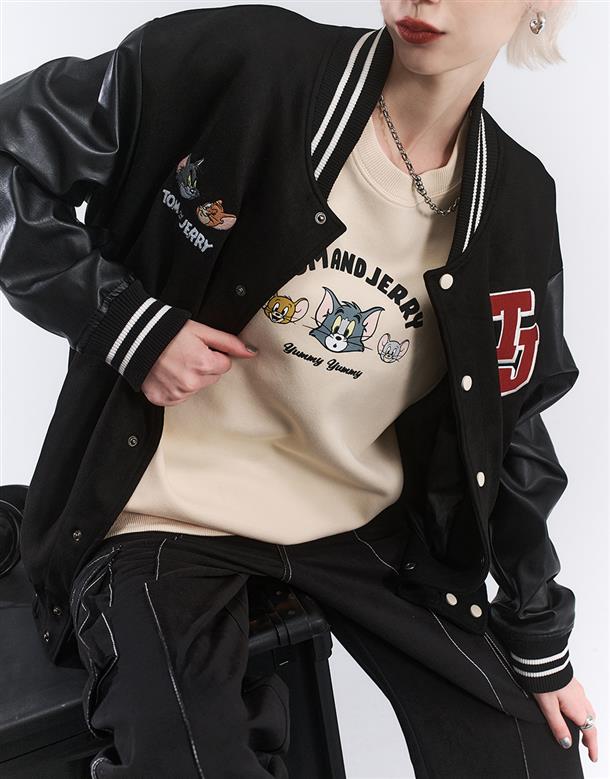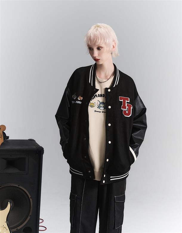 湯姆貓與傑利鼠皮革袖設計,寬鬆棒球外套