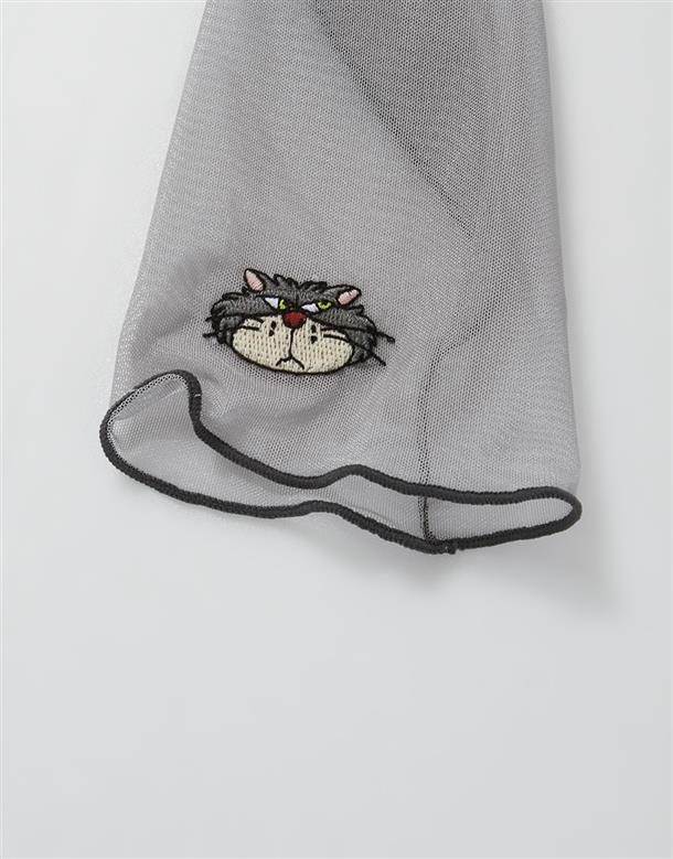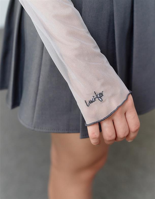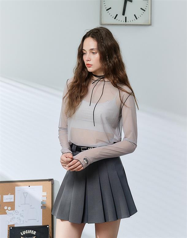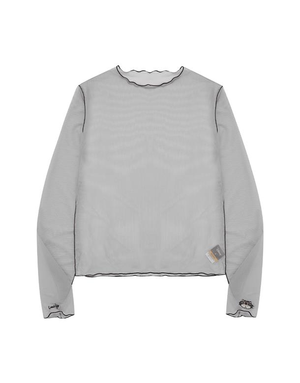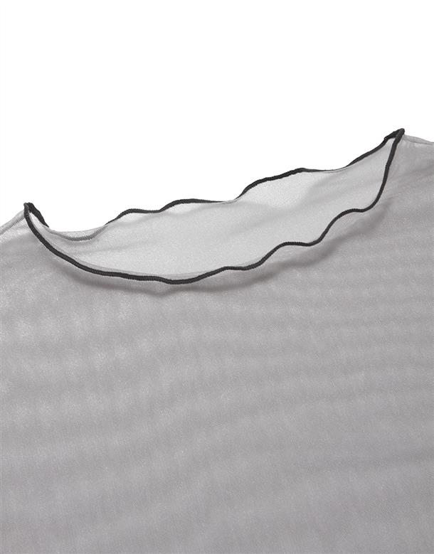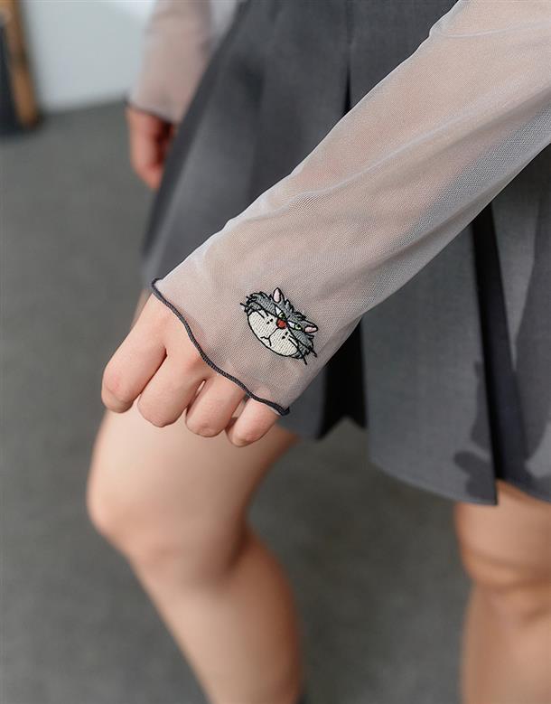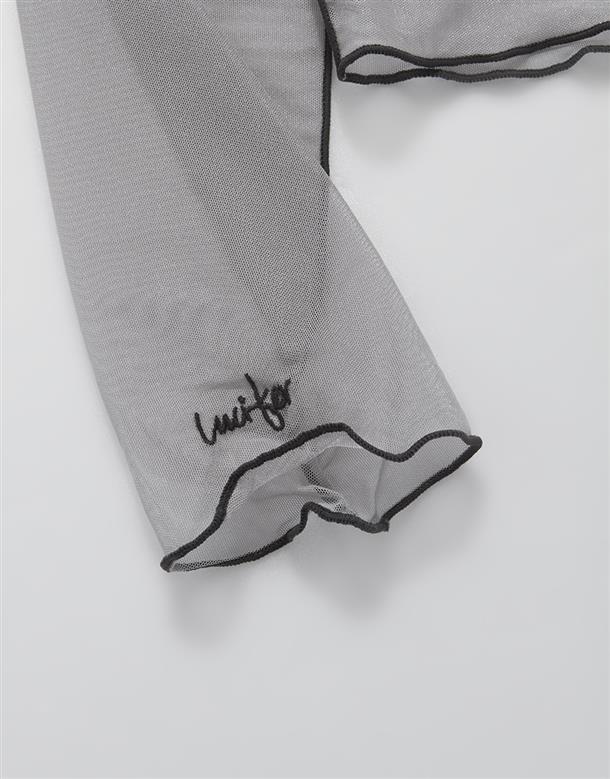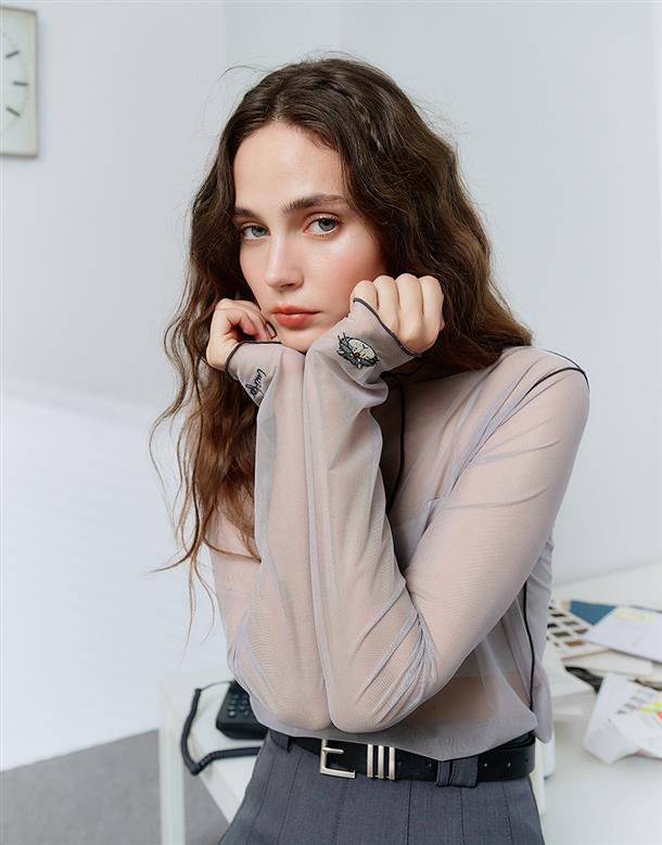 袖口精緻魯斯佛電繡,透膚內搭上衣,搭配流行款