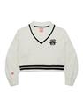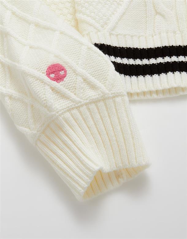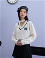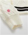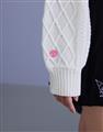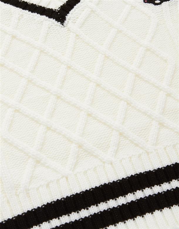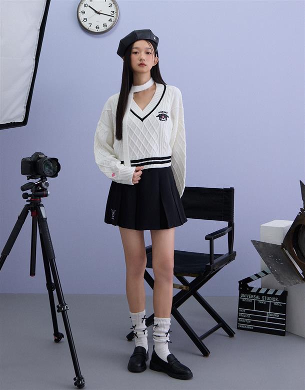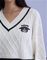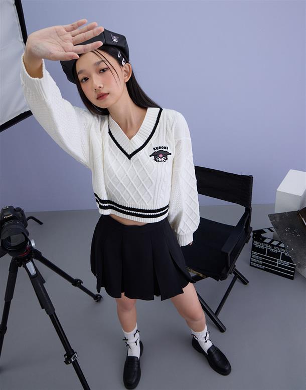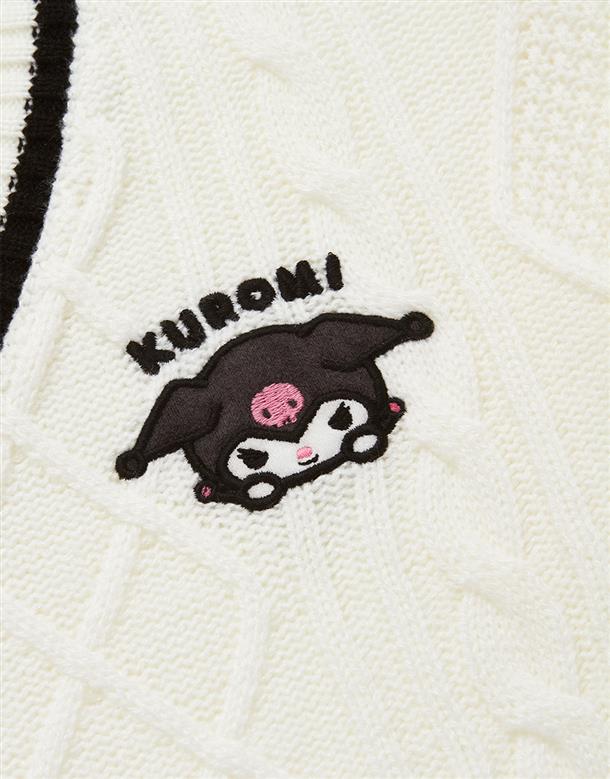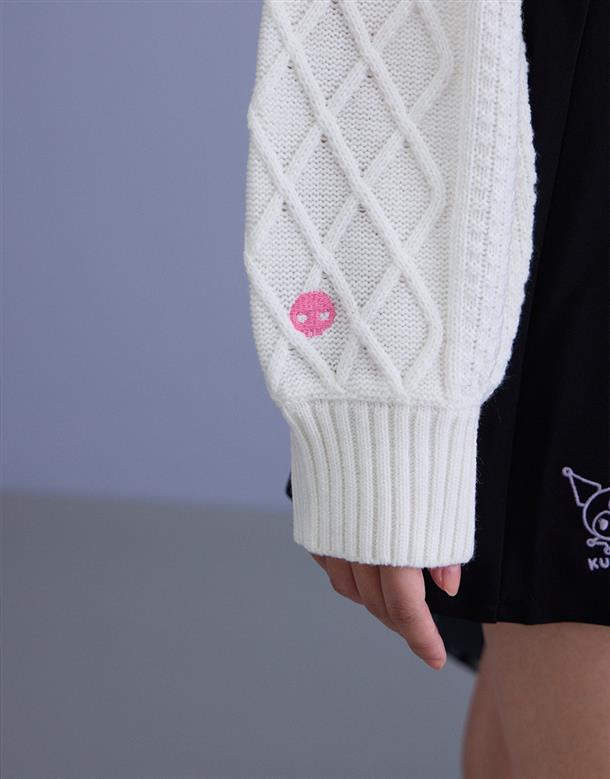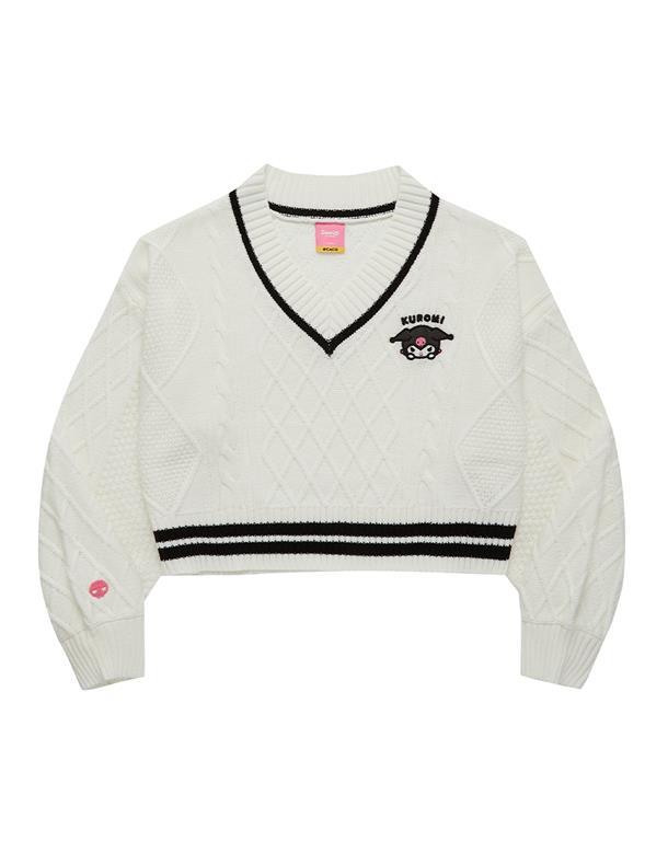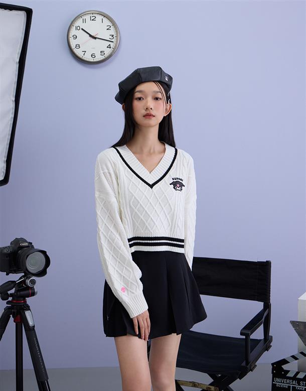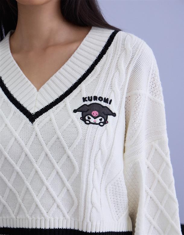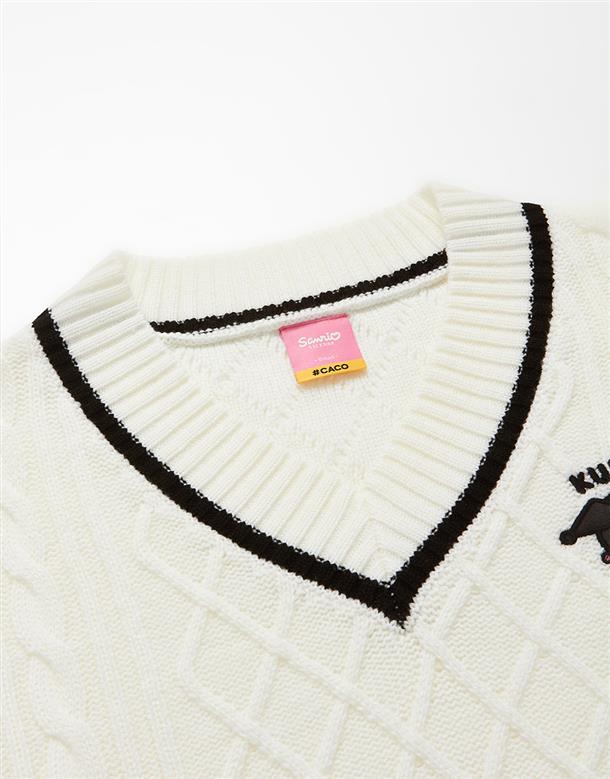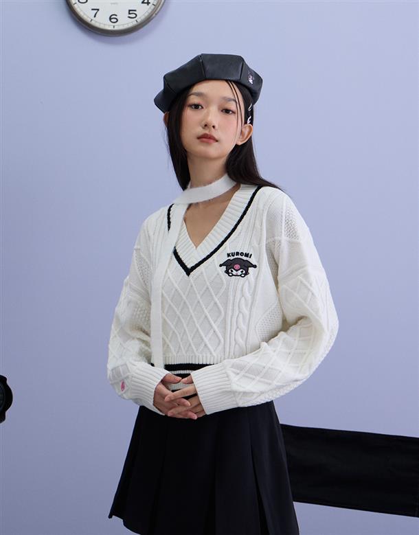 酷洛米系列,柔軟毛織撞色設計,細緻麻花與酷洛米貼布繡花,落肩V領百搭毛衣