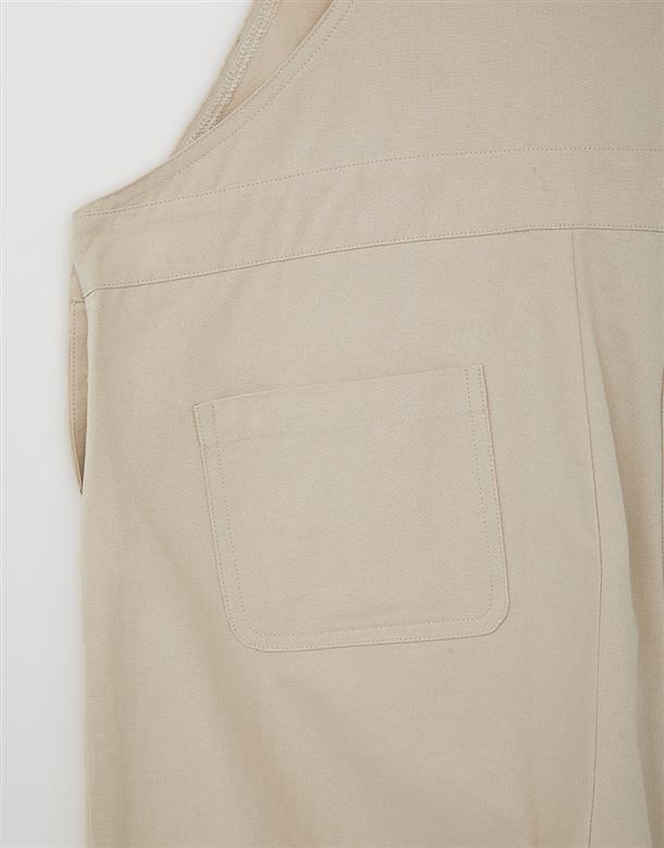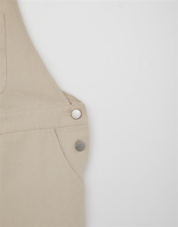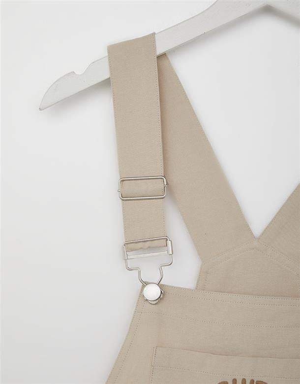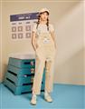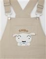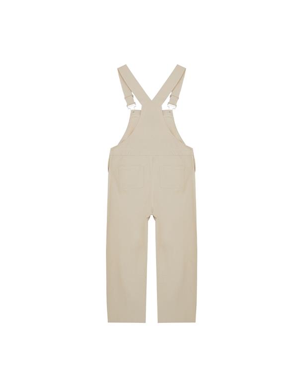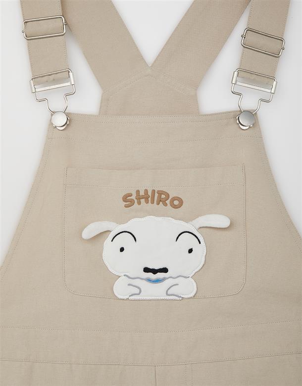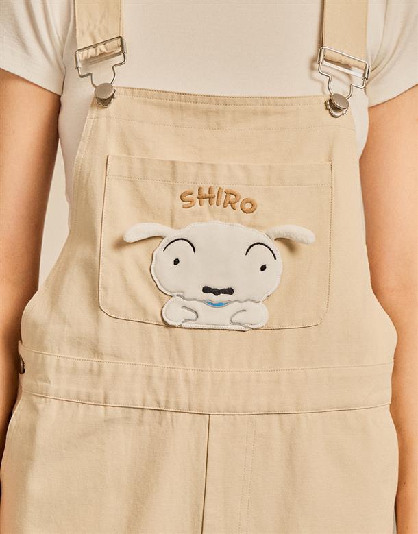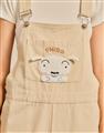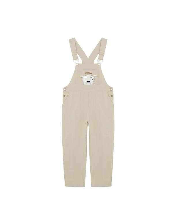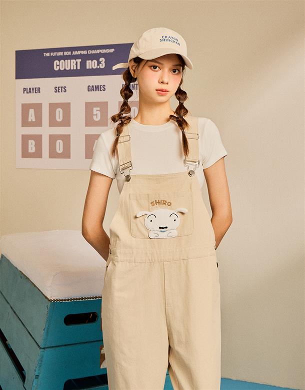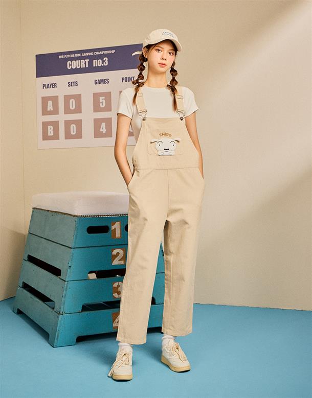 小白貼袋造型貼布繡,趣味立體耳朵設計,搭配款棉斜紋吊帶褲。