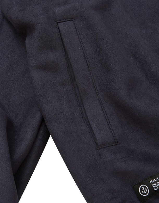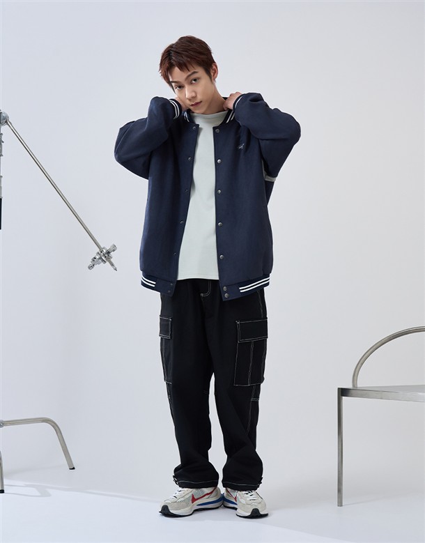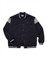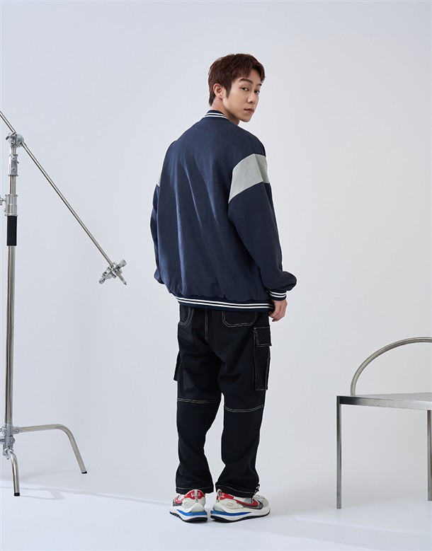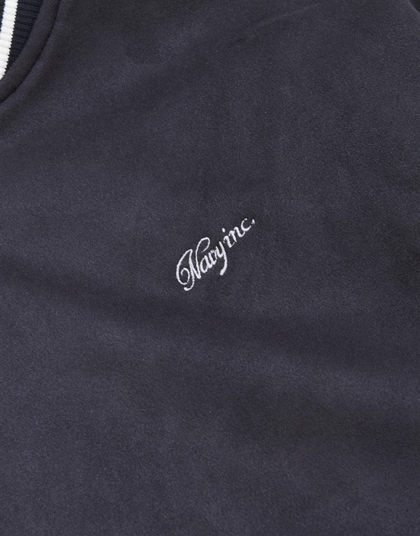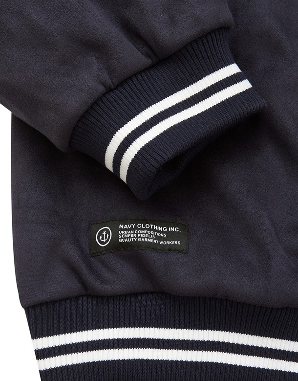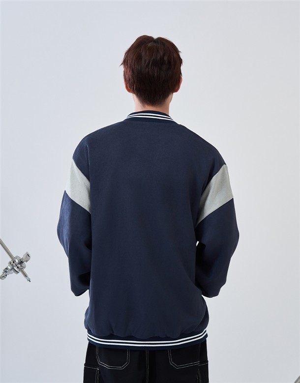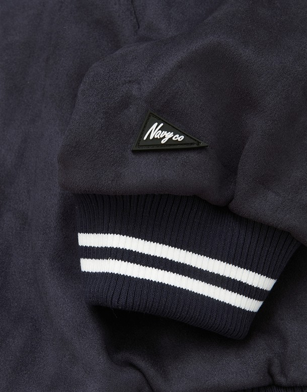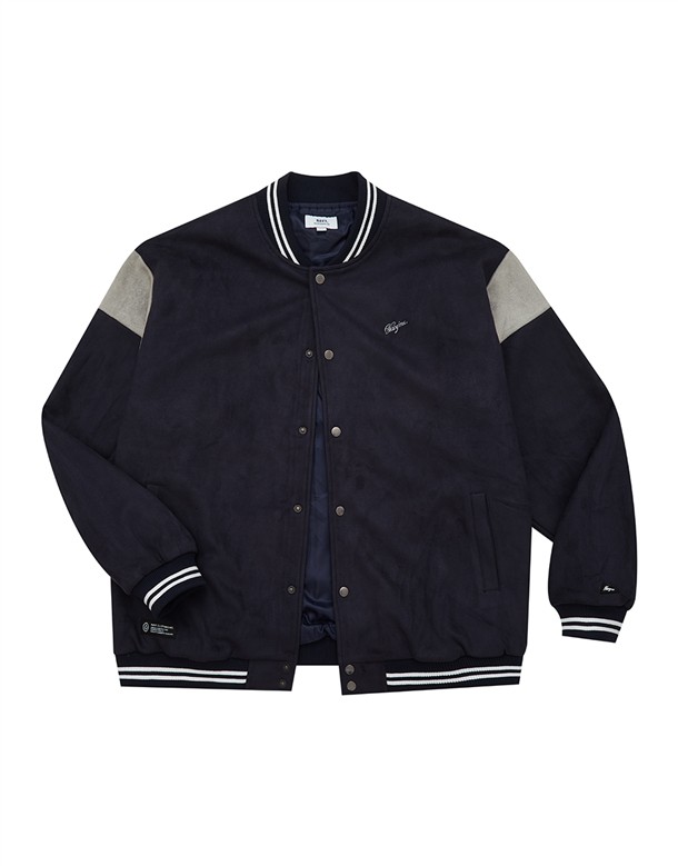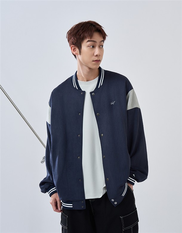 特殊麂絨面料袖襱剪接設計,胸口電繡棒球外套