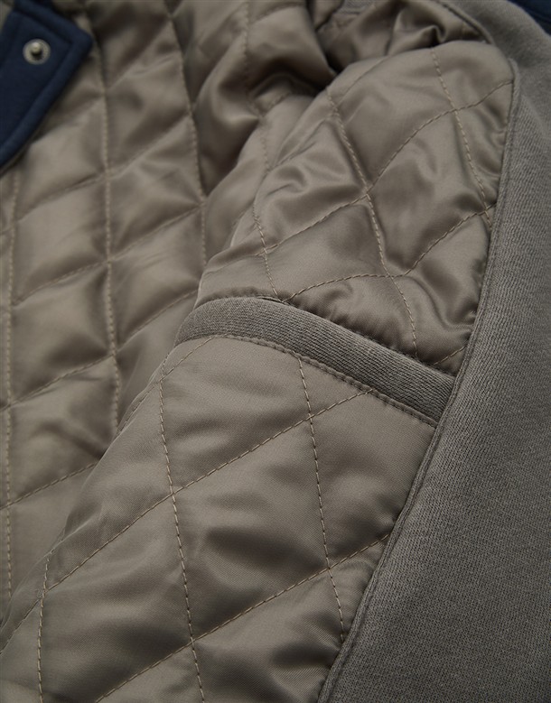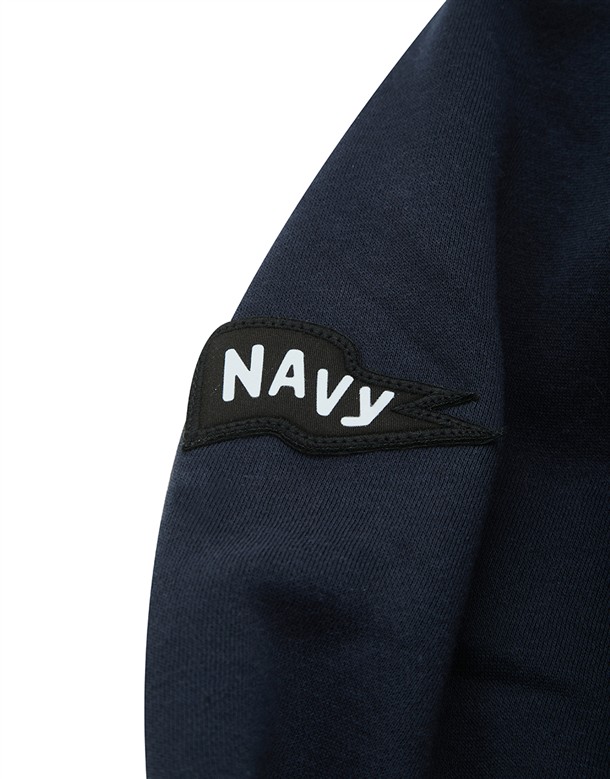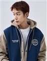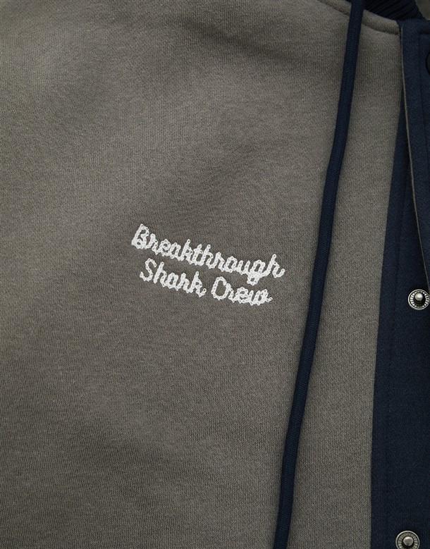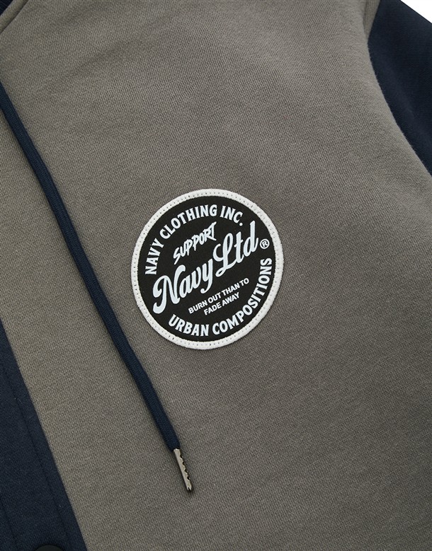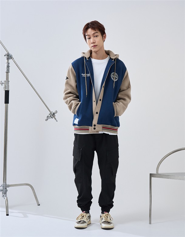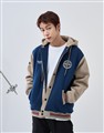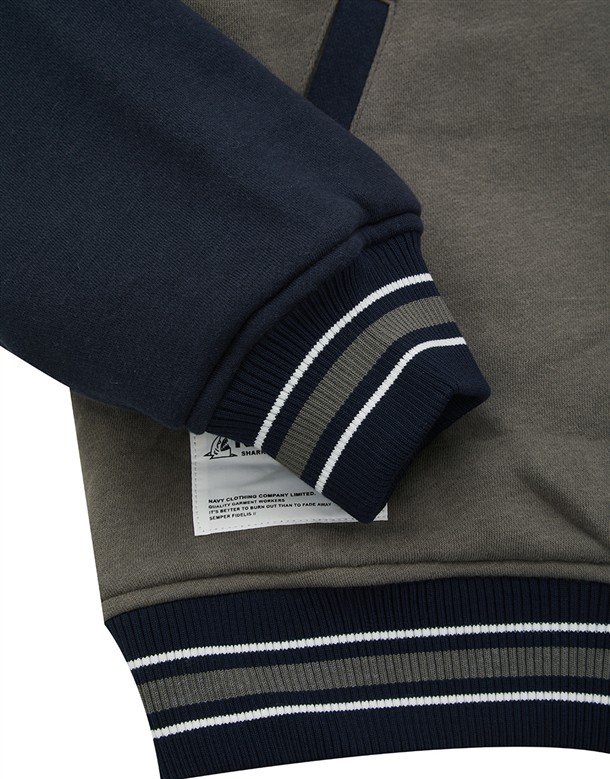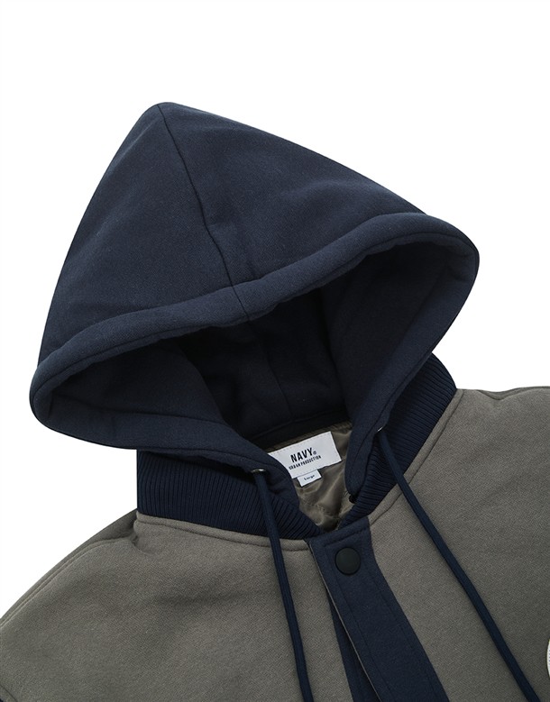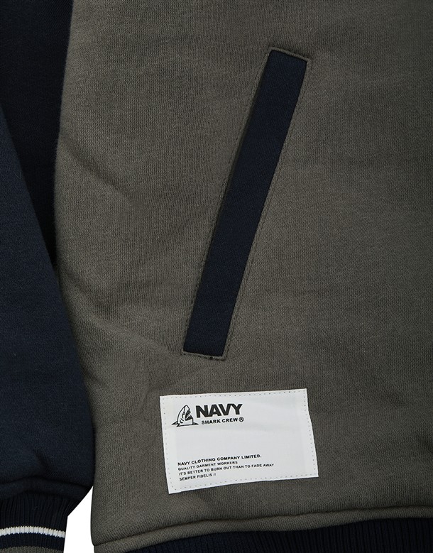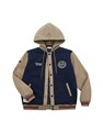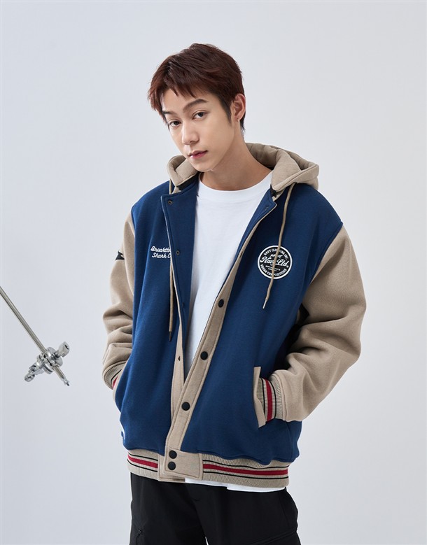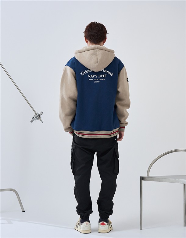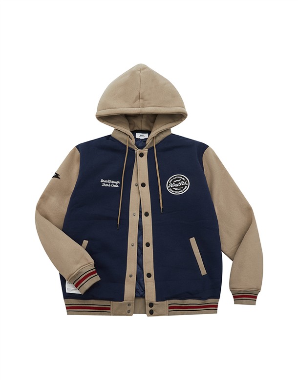 NAVY經典穿搭造型必備,可拆帽款電繡撞色螺紋棒球外套
