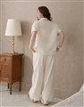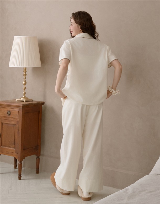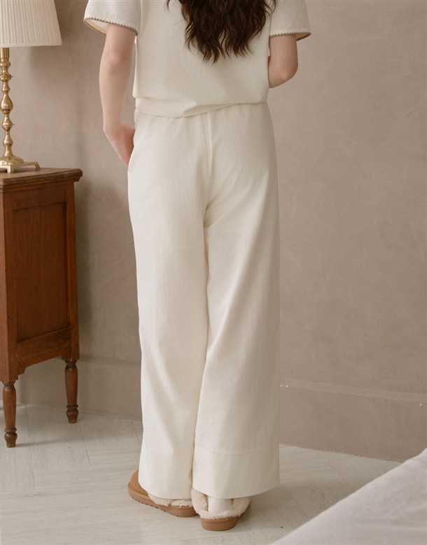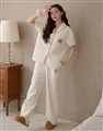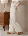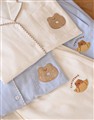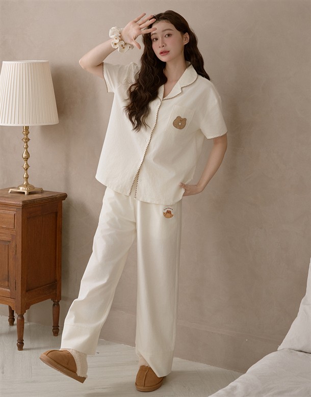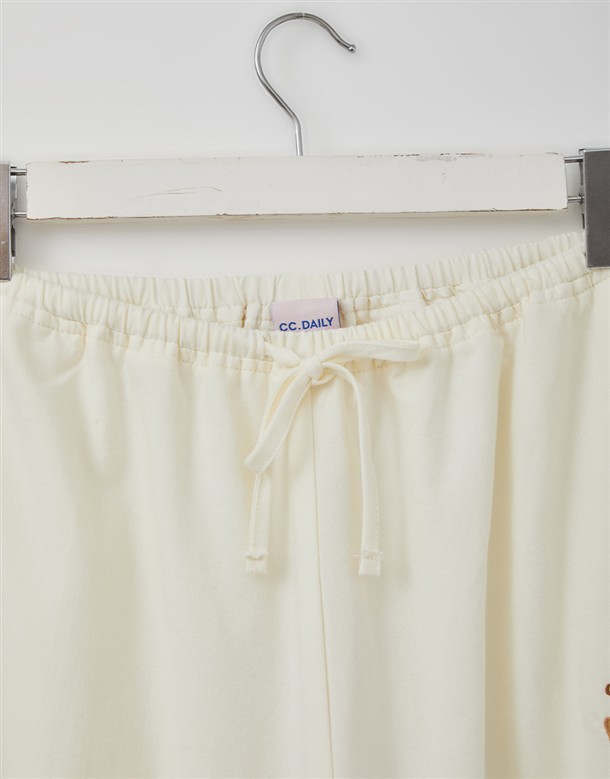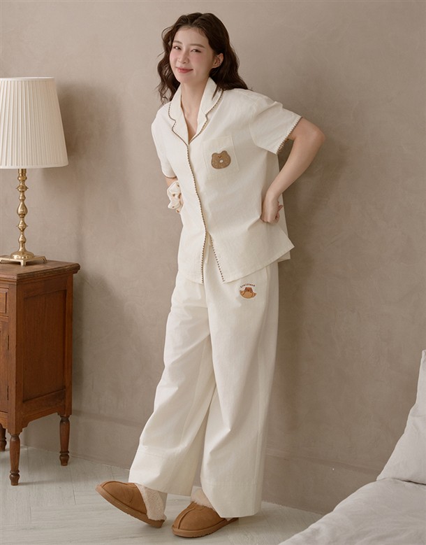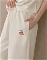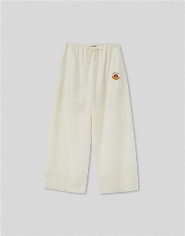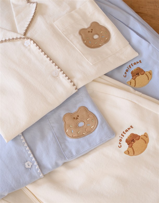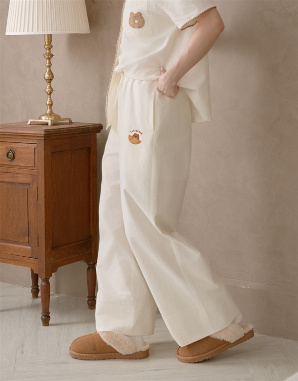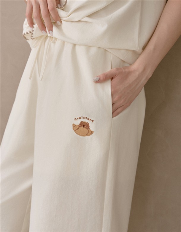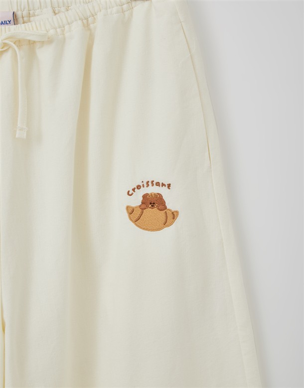 暖心療癒布朗尼插畫設計,全棉親膚舒適面料,可頌繡花設計,腰圍鬆緊帶抽繩設計,有兩側隱形口袋,版型寬鬆,有同面料襯衫上衣和袋子可做整體搭配