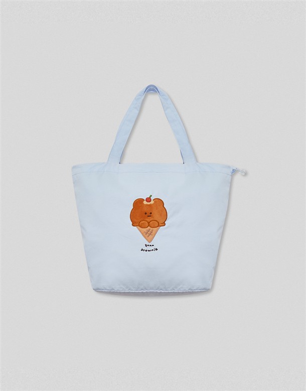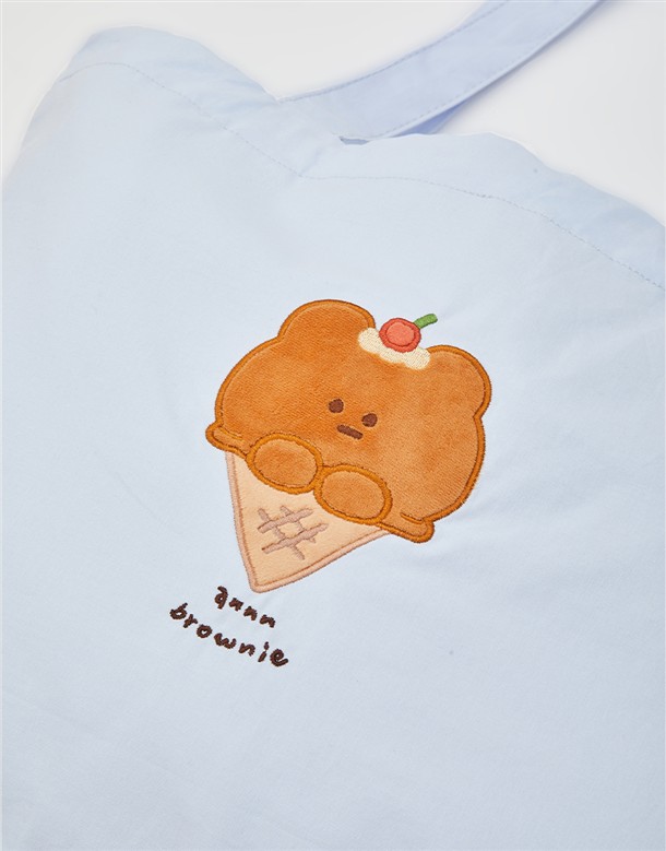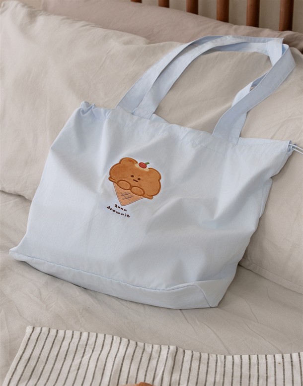 暖心療癒布朗尼插畫設計,全棉親膚舒適面料,布朗尼甜筒電繡+貼布繡設計,袋身底部為立體狀,有附活動式包底墊,容量又好拿取,內有一個拉鍊暗袋可收納小物,袋口有做抽繩設計,可自由變更包型,完整保護內容物不易掉出,有親膚內裡