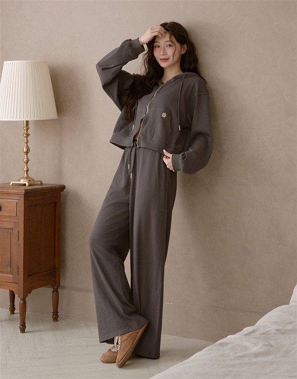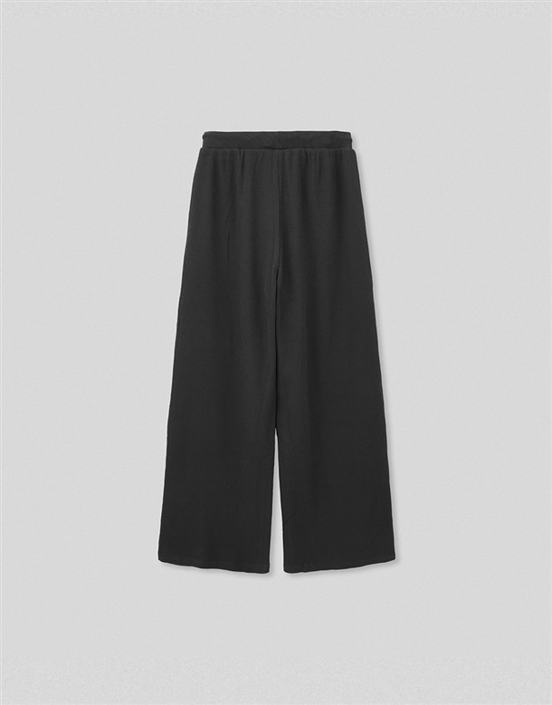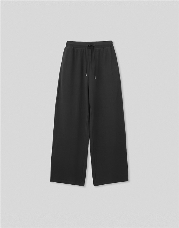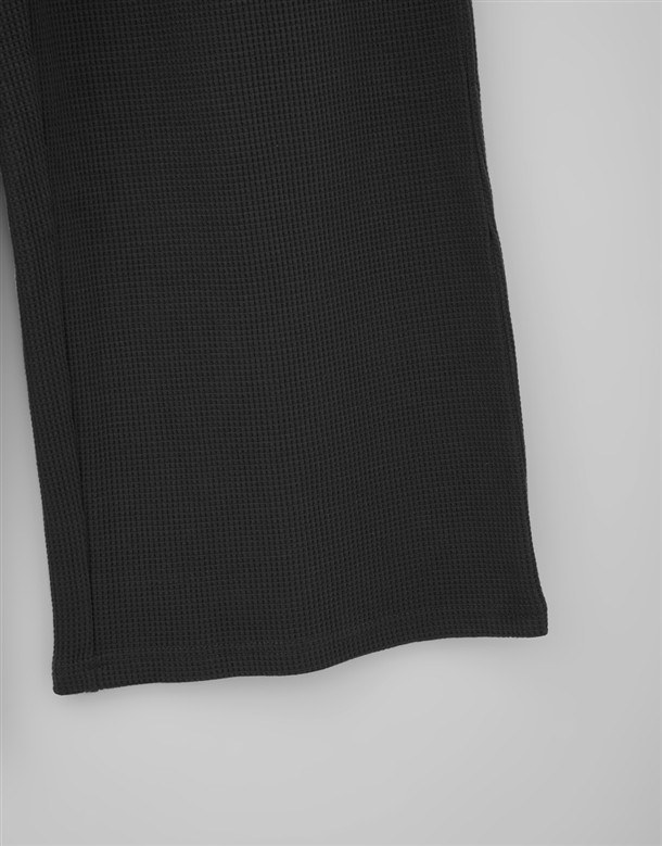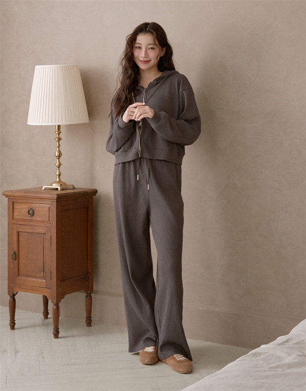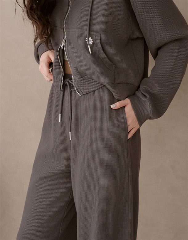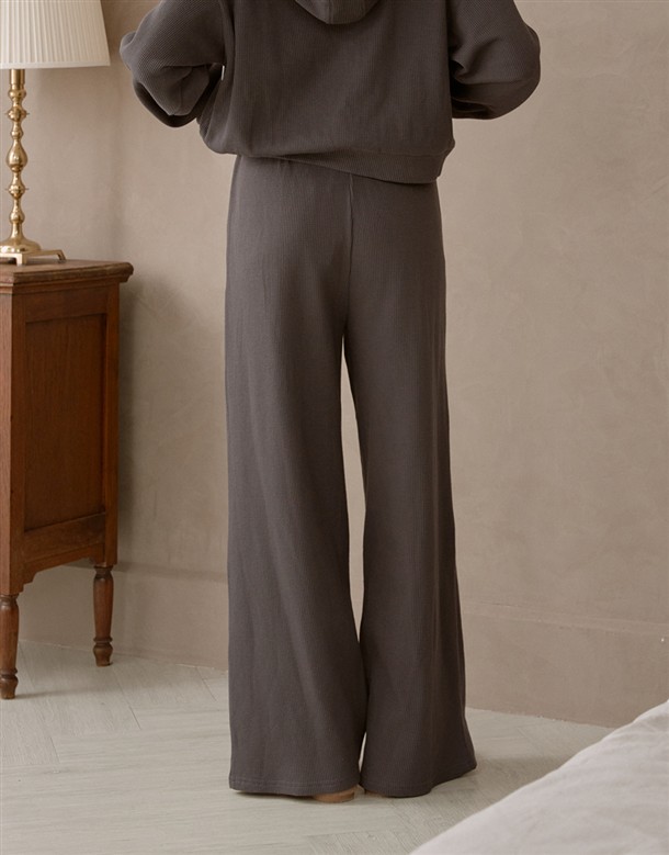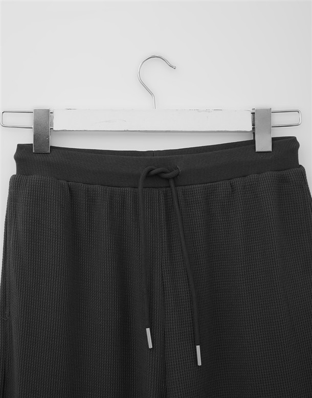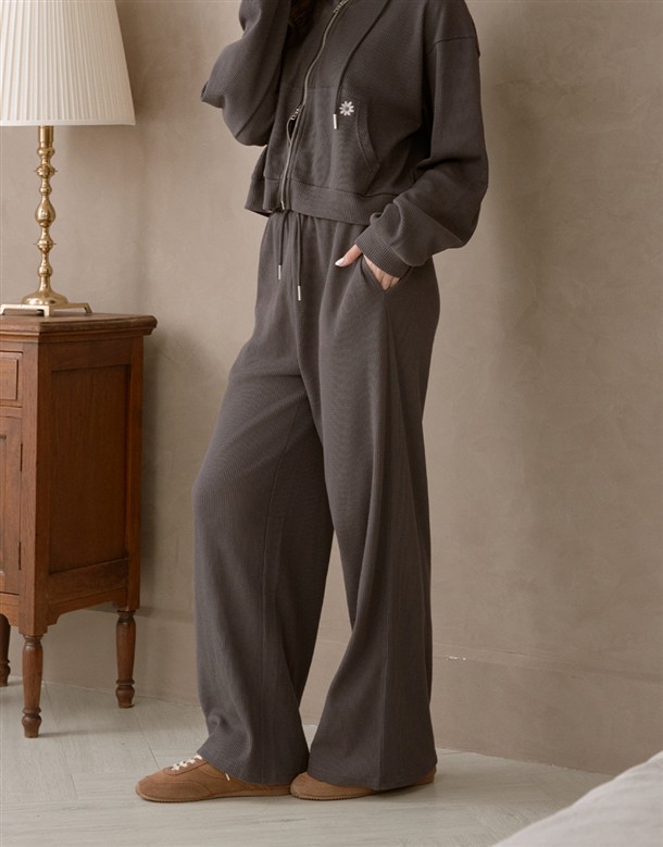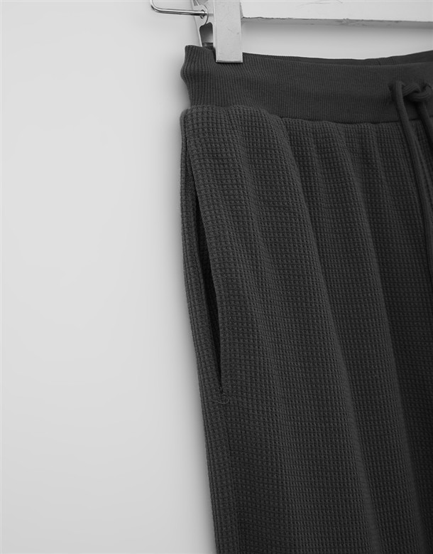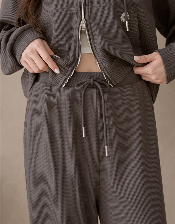 親膚舒適微彈華夫格混棉面料,寬鬆直順版型,自然垂墜隨興休閒感,腰圍鬆緊帶抽繩,有口袋