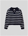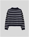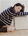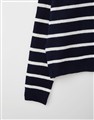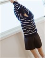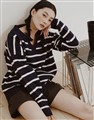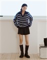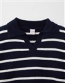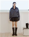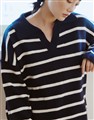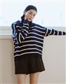 親膚細紋毛織搭配撞色條紋設計,落肩寬鬆V型翻領上衣