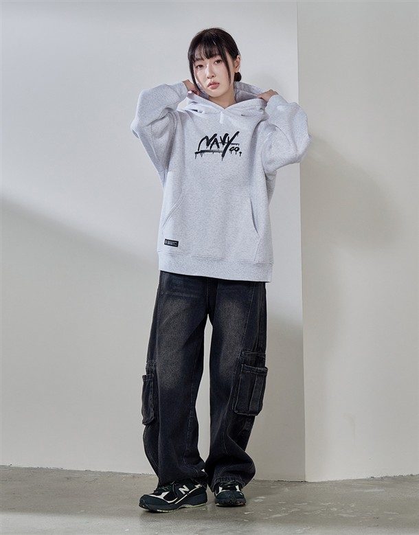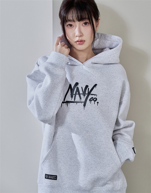 秋冬穿搭造型必備,NAVY塗鴉圖案超柔轉印工藝,寬版微落肩內刷毛保暖材質連帽TEE