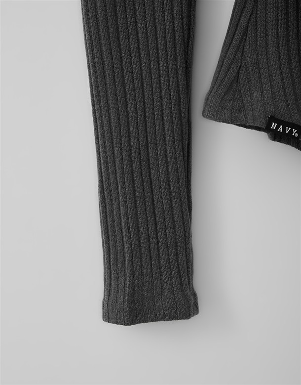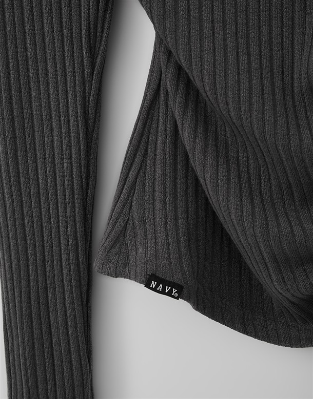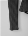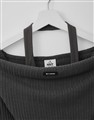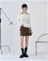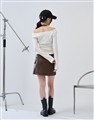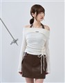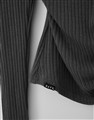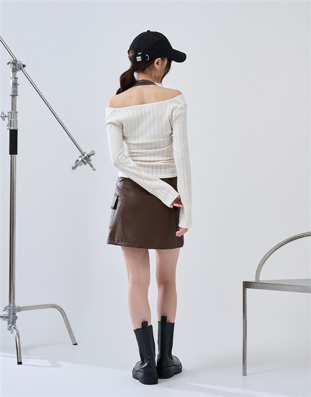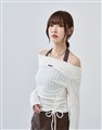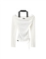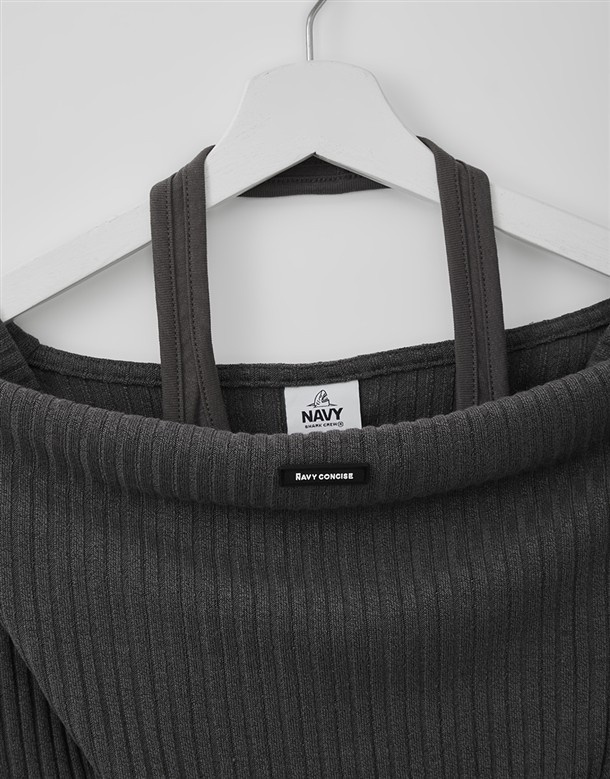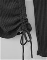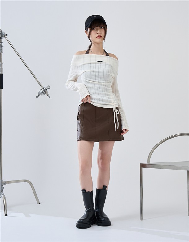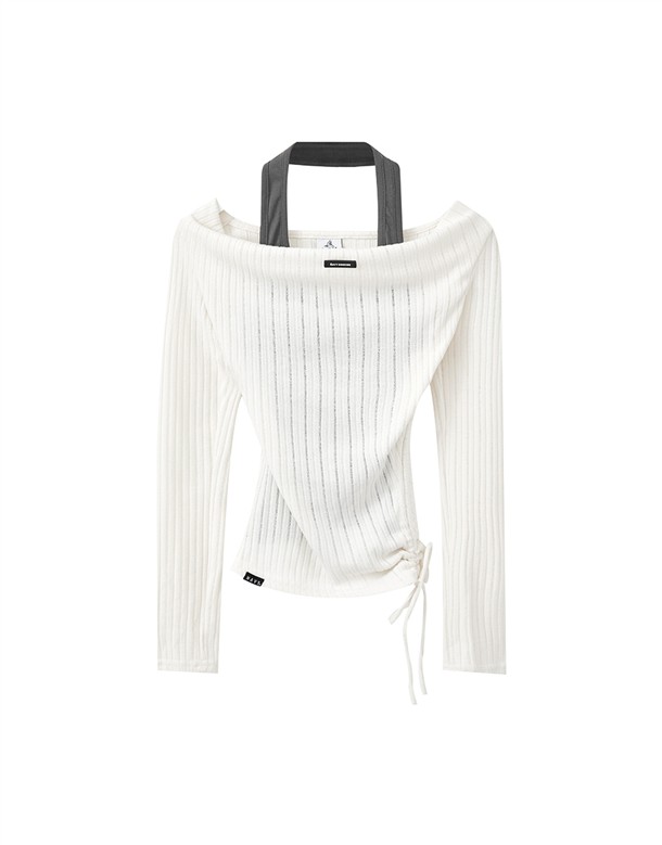 舒適彈性坑條面料,斜角單側抽繩設計,假兩件撞色剪裁,一字領繞頸圍辣穿搭上衣