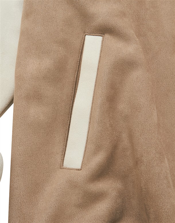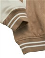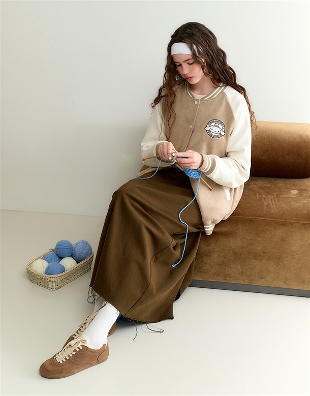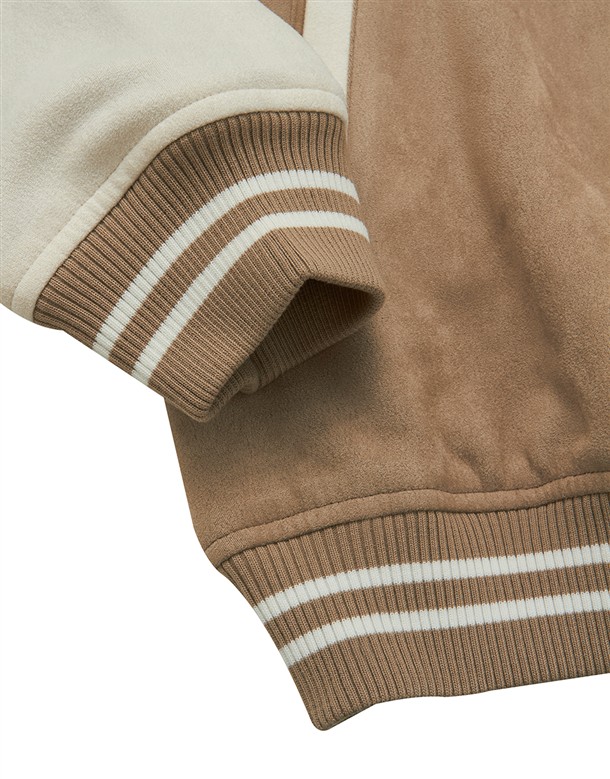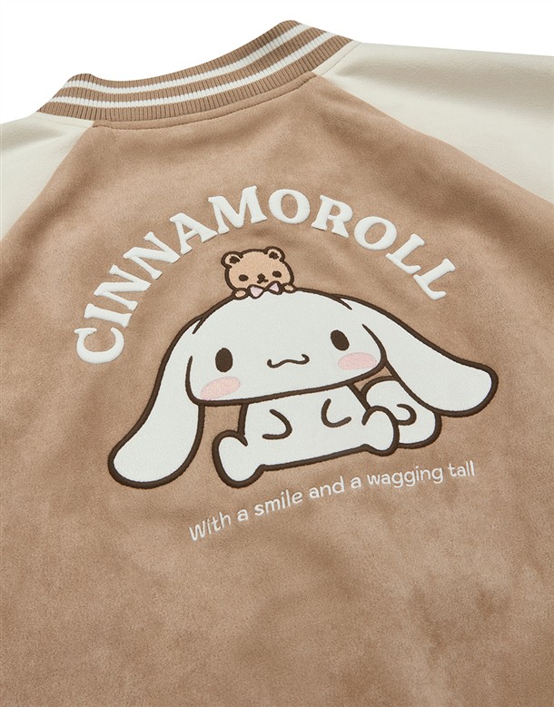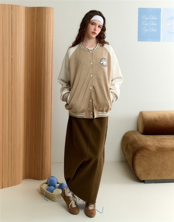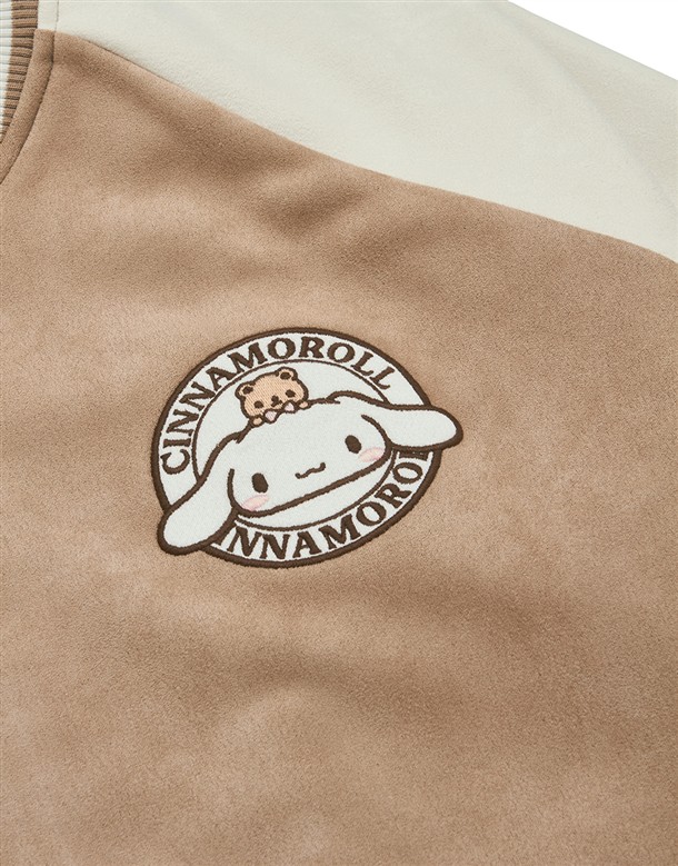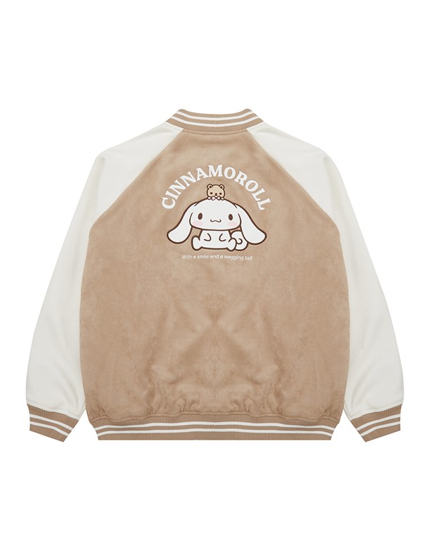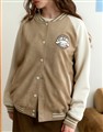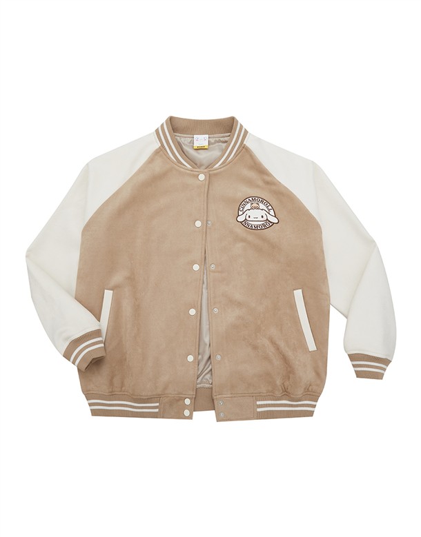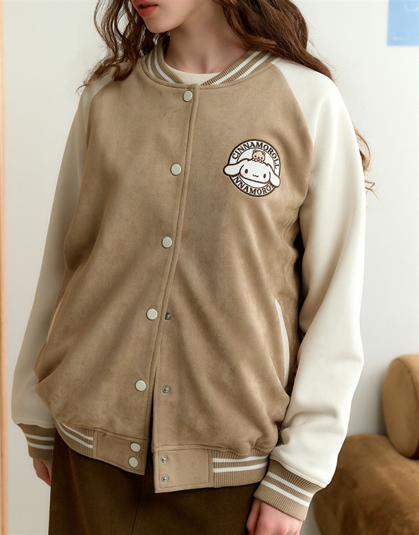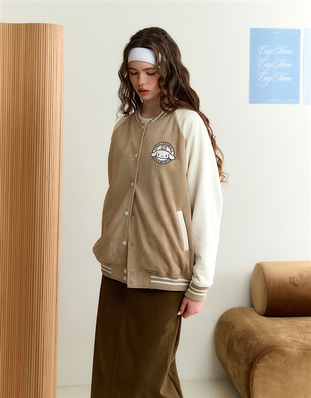 大耳狗前後質感貼布繡設計,麂皮絨棒球外套