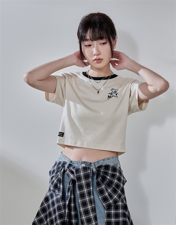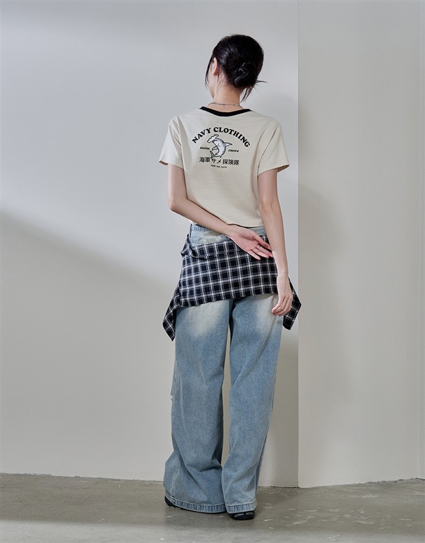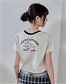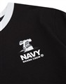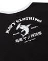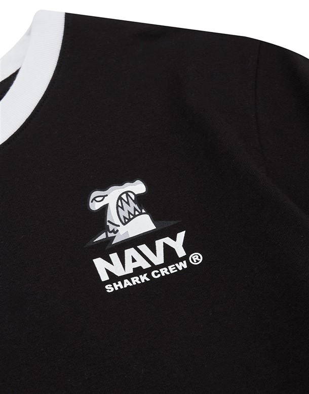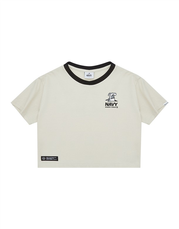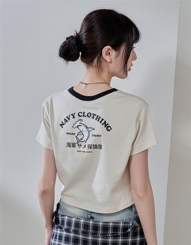 背圖美式弧形字體錘頭鯊海軍探險隊設計款短TEE,女款落肩寬鬆短版
