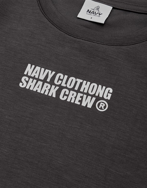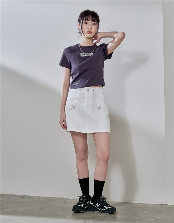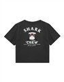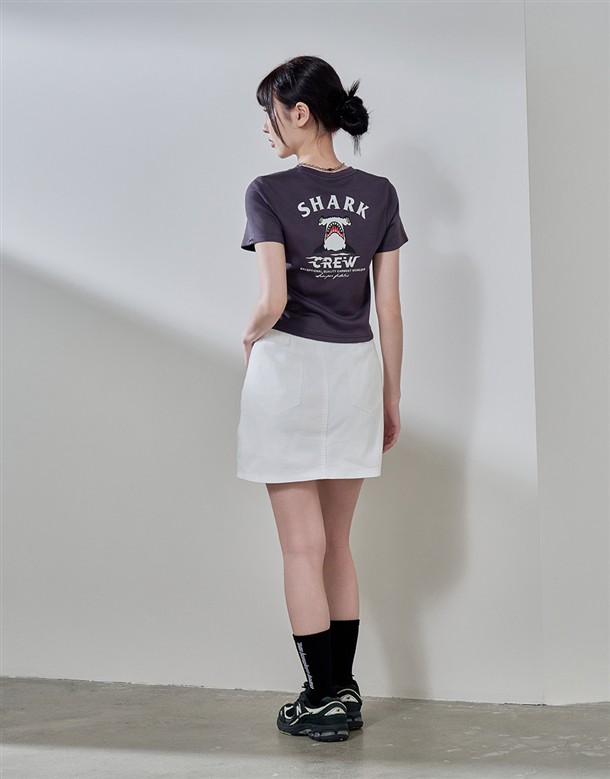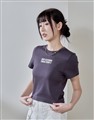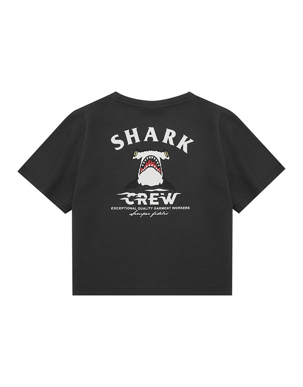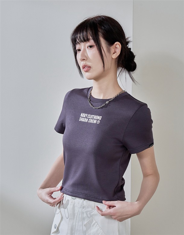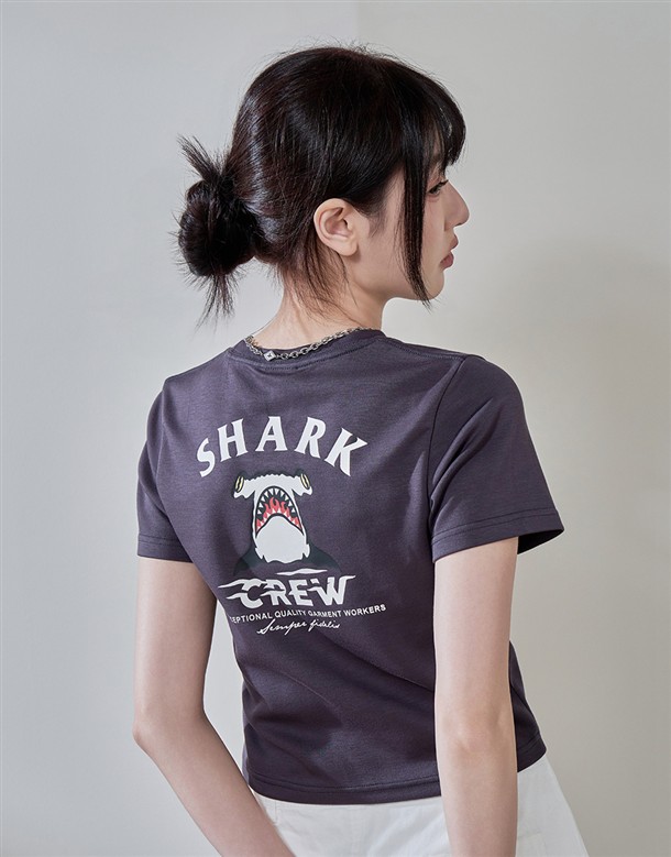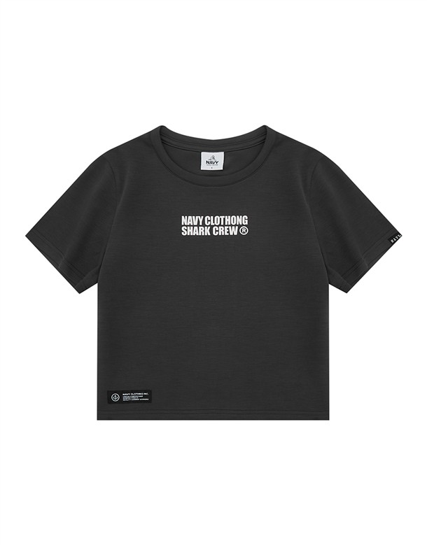 背圖美式弧形字體錘頭鯊火喉嚨風格設計,女款舒適親膚冰感面料,合身彈性短版上衣