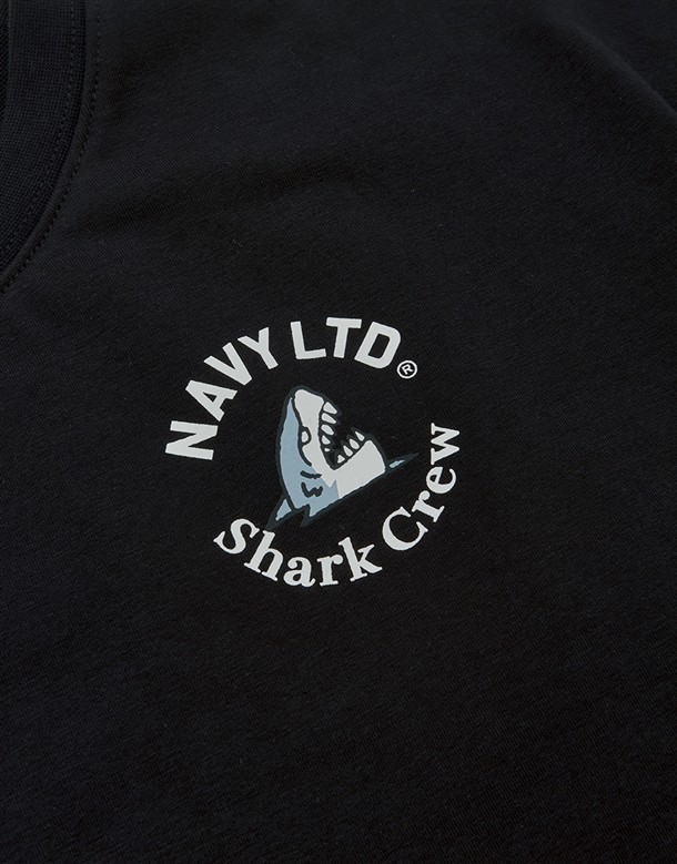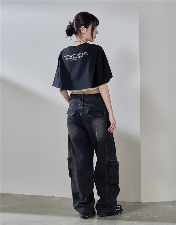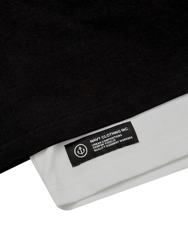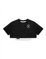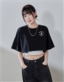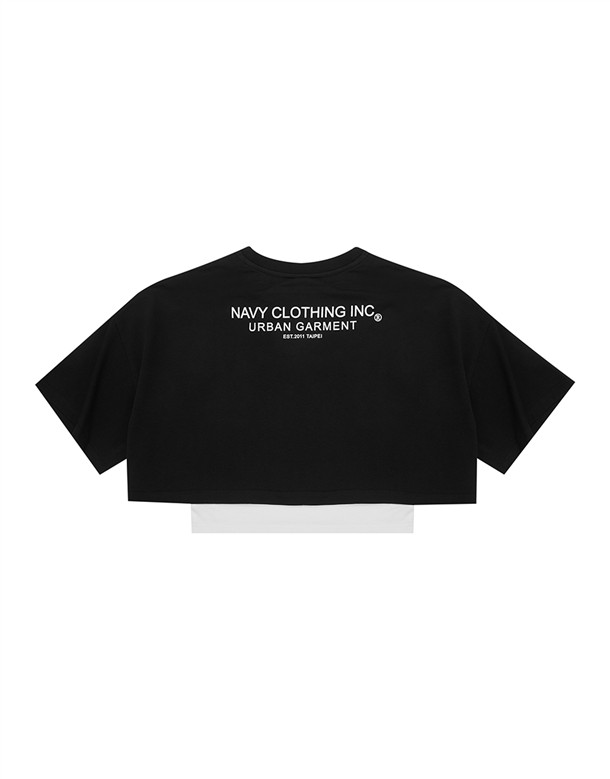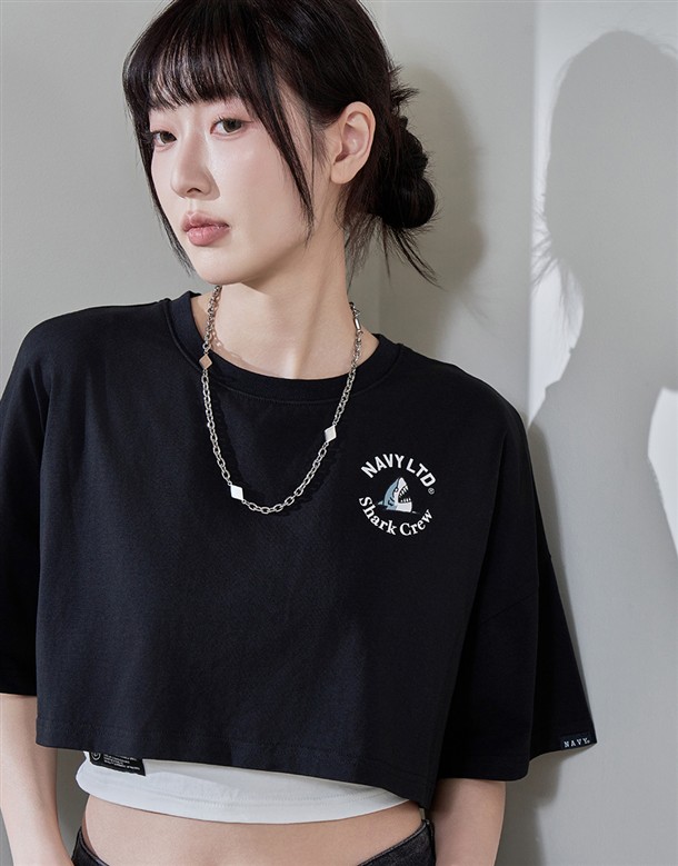 圓形排版字體鯊魚頭美式風格設計,女款假兩件短版上衣