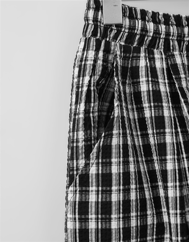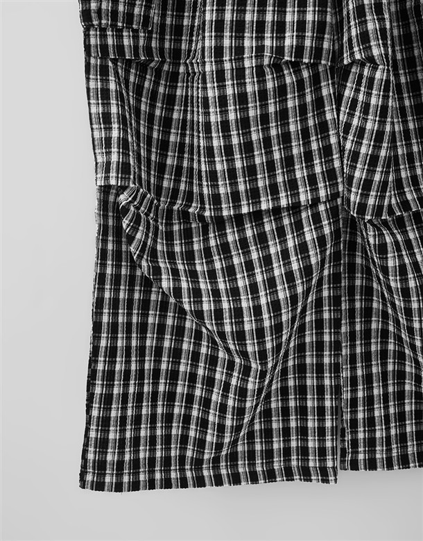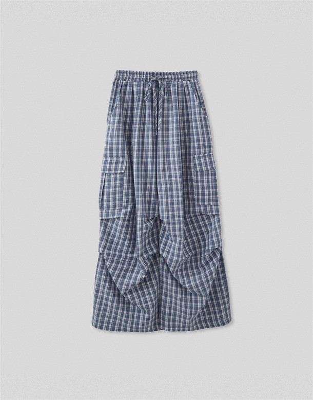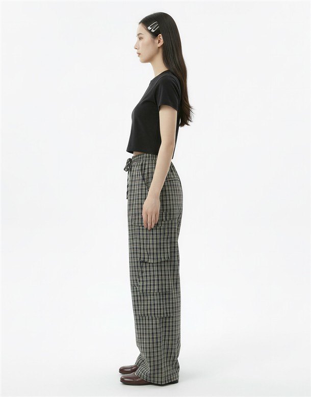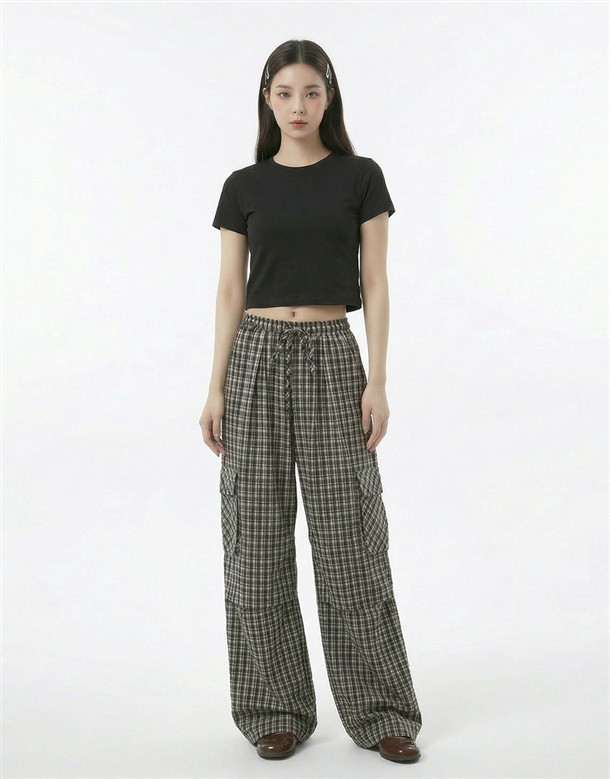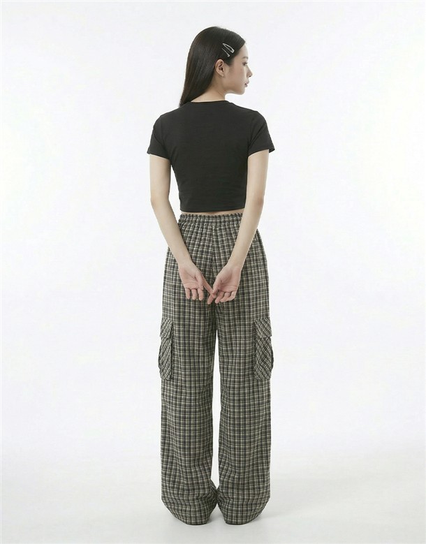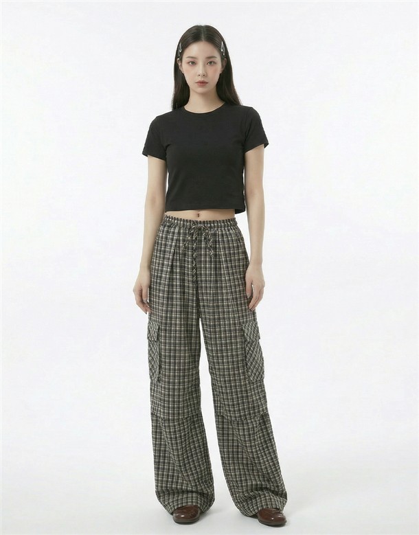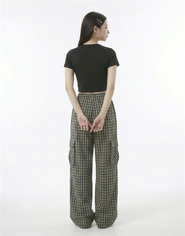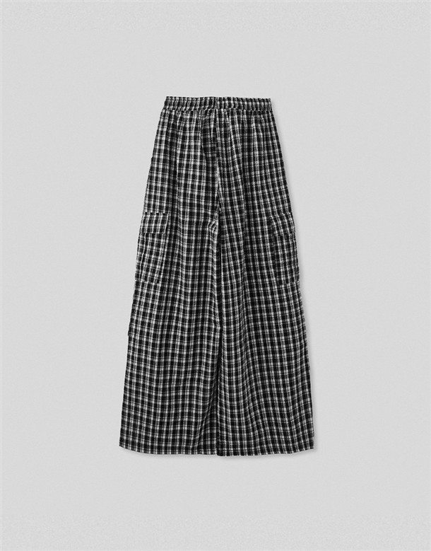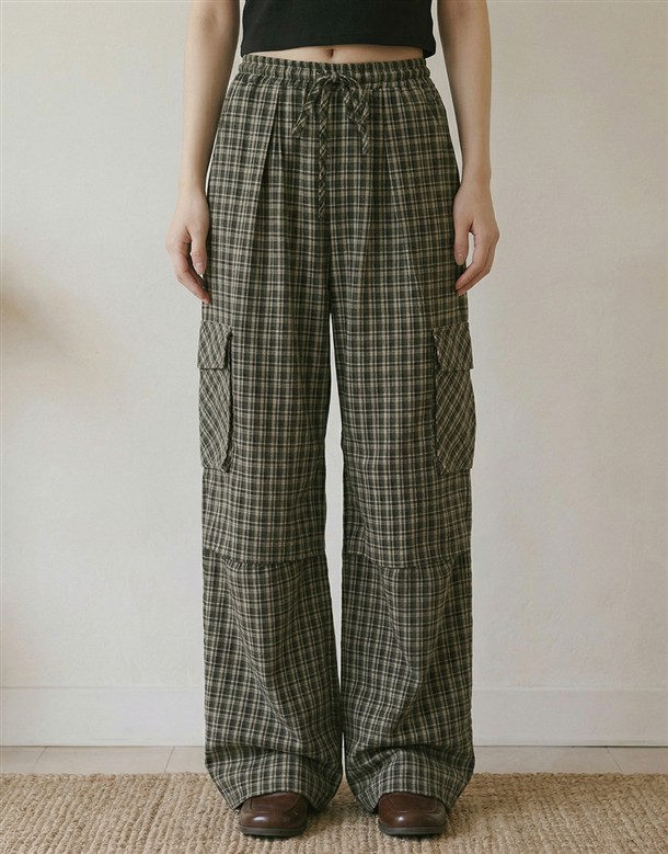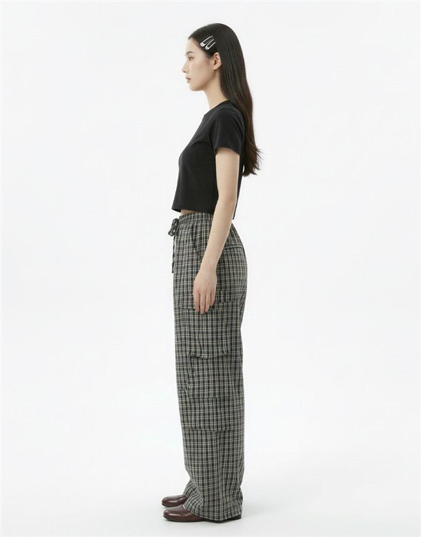 皺皺打褶格紋工裝褲