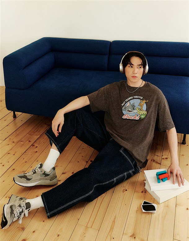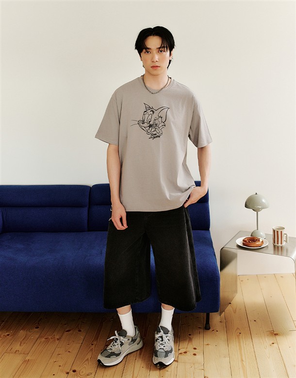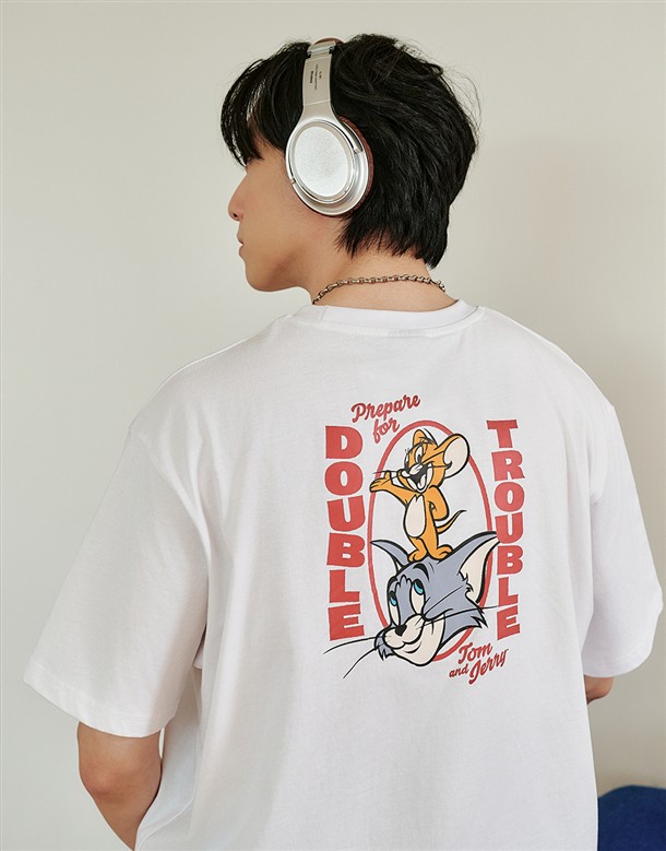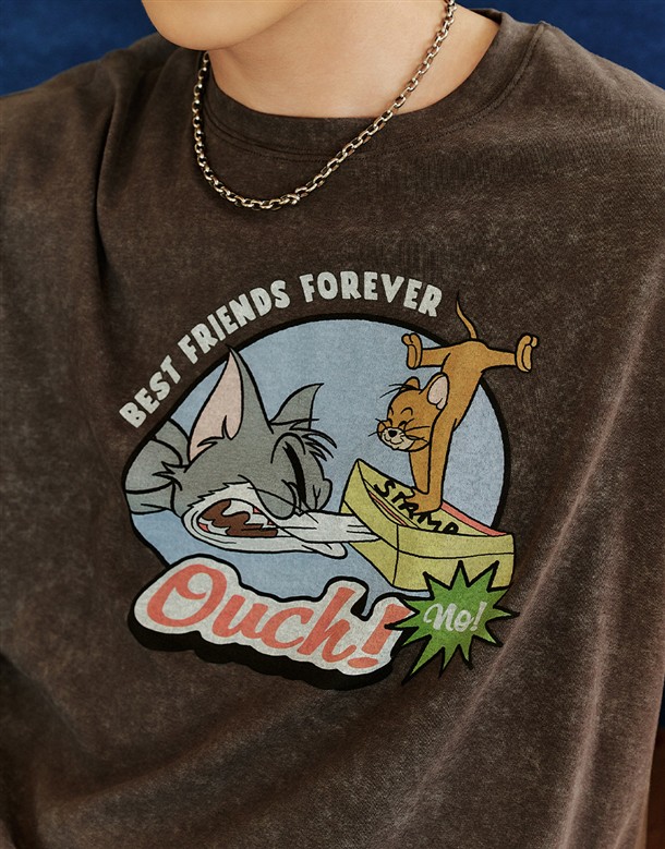 湯姆貓傑利鼠水洗落肩短T